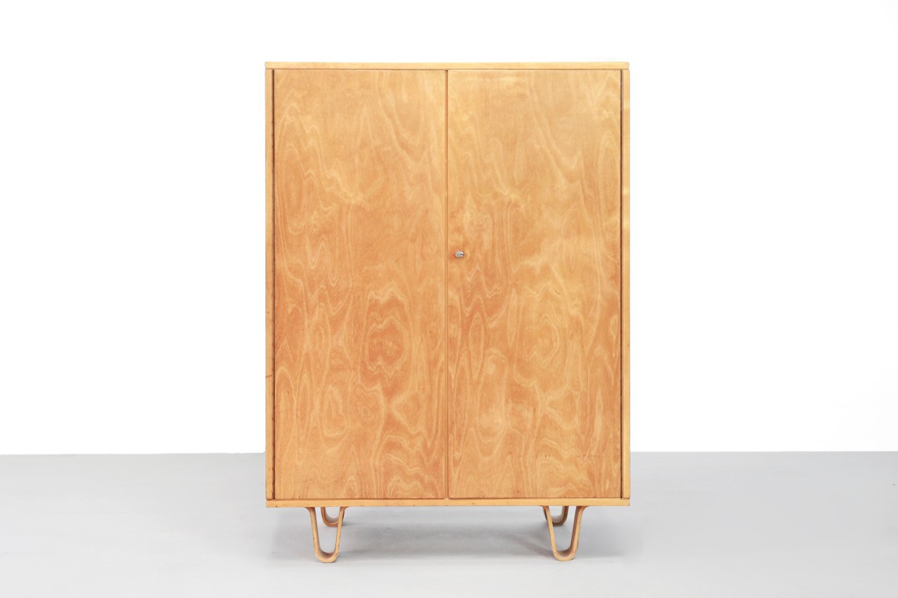 Omschrijving: Cabinet model CB06 ontworpen door Cees Braakman voor Pastoe. Dit wandmeubel is afkomstig uit de berkenserie en heeft prachtige u vormige luspoten. Deze kleine linnenkast heeft twee deuren met twee opbergplanken en vier anti stof laatjes met het gebogen multiplex. De frontjes van de lades zijn origineel door Pastoe in deze kleur gespoten. Deze kast heeft een prettig formaat waarbij hij groot genoeg is om een hoop in op te bergen, maar toch klein genoeg om hem op meerdere plekken in huis kwijt te kunnen. Deze design klassieker is 119 cm hoog, 88 cm breed en 45 cm diep.
