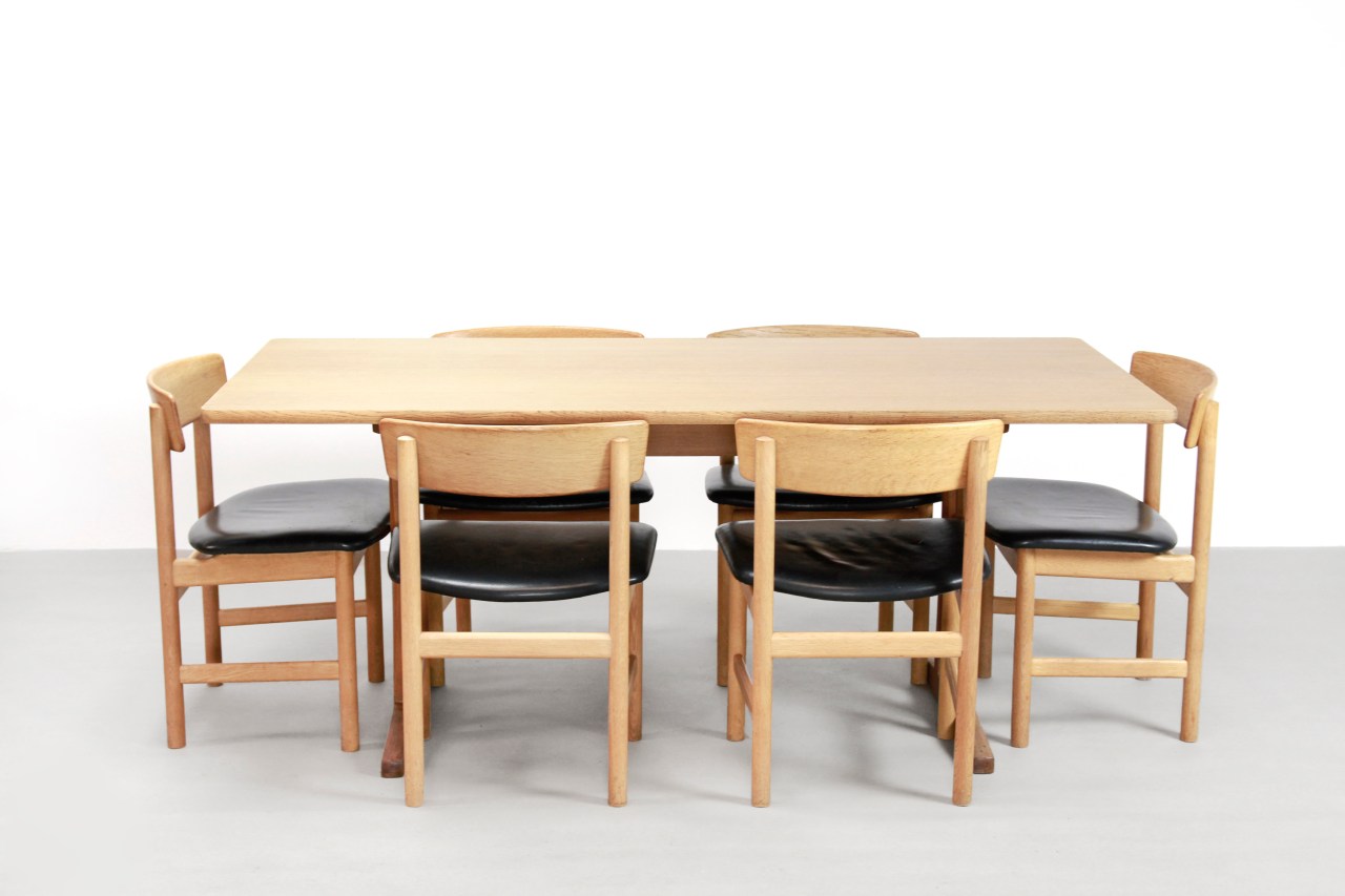 Omschrijving: Mooie eikenhouten eetkamertafel ontworpen door Borge Mogensen en geproduceerd door FDB Mobler vanaf de eind jaren 40. Deze tafel komt uit de jaren 60. De tafel is 180 cm lang, 82 cm diep en 73,5 cm hoog. Bij deze tafel verkopen wij ook 6 prachtige minimalistische eiken eetkamerstoelen bekleed met zwart leer, welke ook ontworpen is door Borge Mogensen maar geproduceerd door Fredericia. Deze stoelen hebben de prachtige natuurlijke en minimalistische shaker vormgeving zoals je van Mogensen gewend bent. Deze stoel heeft de naam 3236 en is de ‘verbeterde’ versie van de bekende People’s chair die hij eind jaren 40 ontworpen heeft. Deze degelijke stoelen zijn gemaakt van massief hout welke gelakt is. Het hout is daardoor in de loop der tijd mooi licht gebleven.