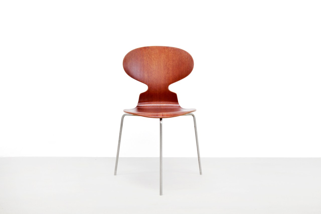 Omschrijving: Prachtige stoel ontworpen door Arne Jacobsen voor Fritz Hansen in Denemarken. De officiële naam van de stoelen is ‘stoel 3100’, maar ze worden door hun vorm ook wel ‘de mier’ genoemd. Bijzonder aan deze stoelen zijn de onderstellen met drie poten. Arne Jacobsen bedacht deze stoelen met drie poten, om zo het probleem van poten die met elkaar in de knoop kwamen onder een ronde tafel, te verhelpen. Toen hij met dit idee naar de producent kwam, weigerde hij om ze te produceren. Toch wilde Arne Jacobsen perse deze mierstoelen met drie poten. Hij zocht net zo lang tot hij een klant vond die geïnteresseerd was in een groot aantal stoelen, dit werd Novo Nordisk en zo werden deze stoelen met drie poten toch in productie genomen. Deze stoel is een zeer vroege editie uit de jaren 50 en is uitgevoerd in teak. Gebruik deze stoel als toevoeging aan de collectie eetkamer stoelen aan tafel, of gebruik hem voor aan een bureau, kaptafel of in de slaapkamer.