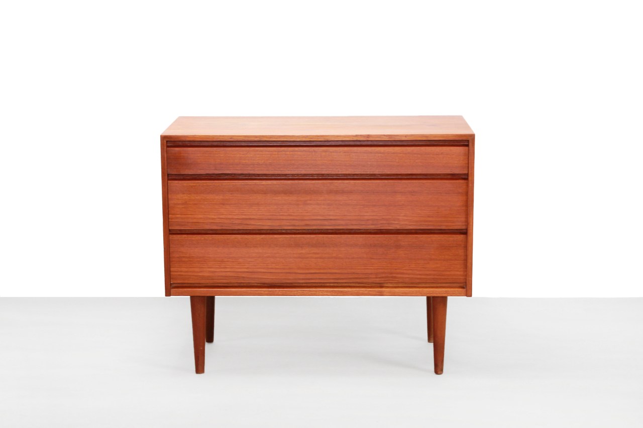 Omschrijving: Deens design ladekast met drie lades met prachtige diepliggende greepjes in de stijl van de kasten van Poul Cadovius. De vormgeving van het kastje is modernistisch, recht en zonder poespas. Dit maakt het kastje een tijdloos model. Fijn formaat die je op meerdere plekken in het huis kwijt kunt en waar je veel in op kunt bergen. Deze kast is 84,5 cm breed, 41,5 cm diep en 70 cm hoog.