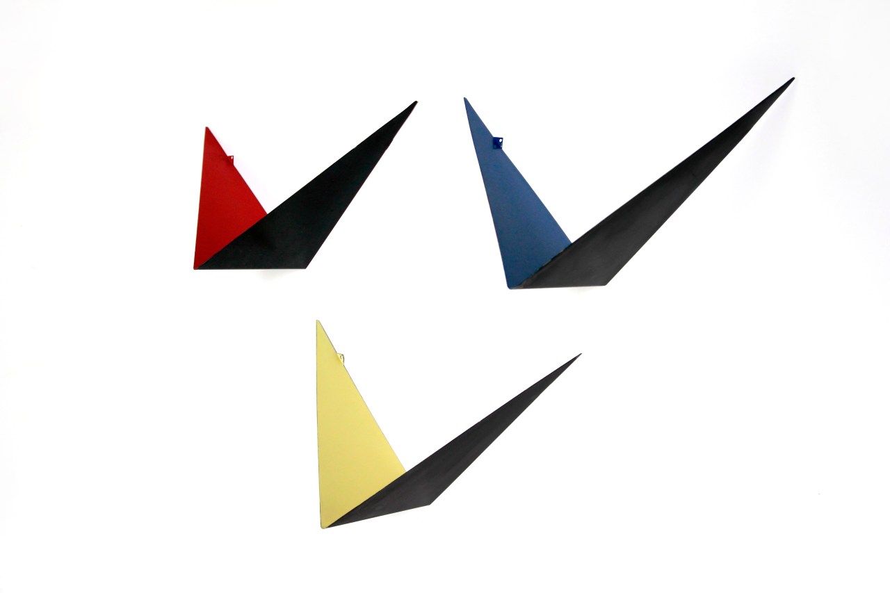 Omschrijving: Mooie zeldzame set metalen ‘Butterfly’ boekenplanken ontworpen door Poul Cadovius in de jaren 60 in Denemarken. Het ontwerp van deze metalen planken is simplistisch maar ontzettend sterk in uitstraling. De planken zijn zwart aan de buitenkant en rood, geel en blauw aan de binnenkant. Gebruik deze planken als nachtkastjes, of als wandsysteem voor boeken, plantjes of andere verzamelingen. Zonder er iets op te plaatsen zijn deze planken ook zeer geschikt als kunstwerk voor aan de muur. De planken zijn 25 cm hoog, 42 cm breed en 18 cm diep.