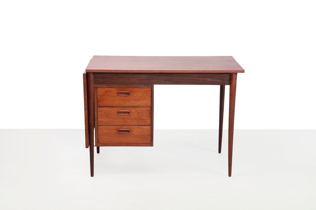 Omschrijving: Klein maar fijn verstelbaar bureau geproduceerd door Hulmefa maar vaak toegeschreven aan Arne Vodder. Het blad kan naar rechts geschoven worden zodat het extra blad wat aan de zijkant hangt naar boven komt waardoor er meer werkruimte ontstaat. Dit bureau is gemaakt van massief teakhouten poten en een teak gefineerd blad en lades. Het is een simpel minimalistisch ontwerp maar daarom juist zo toepasbaar.