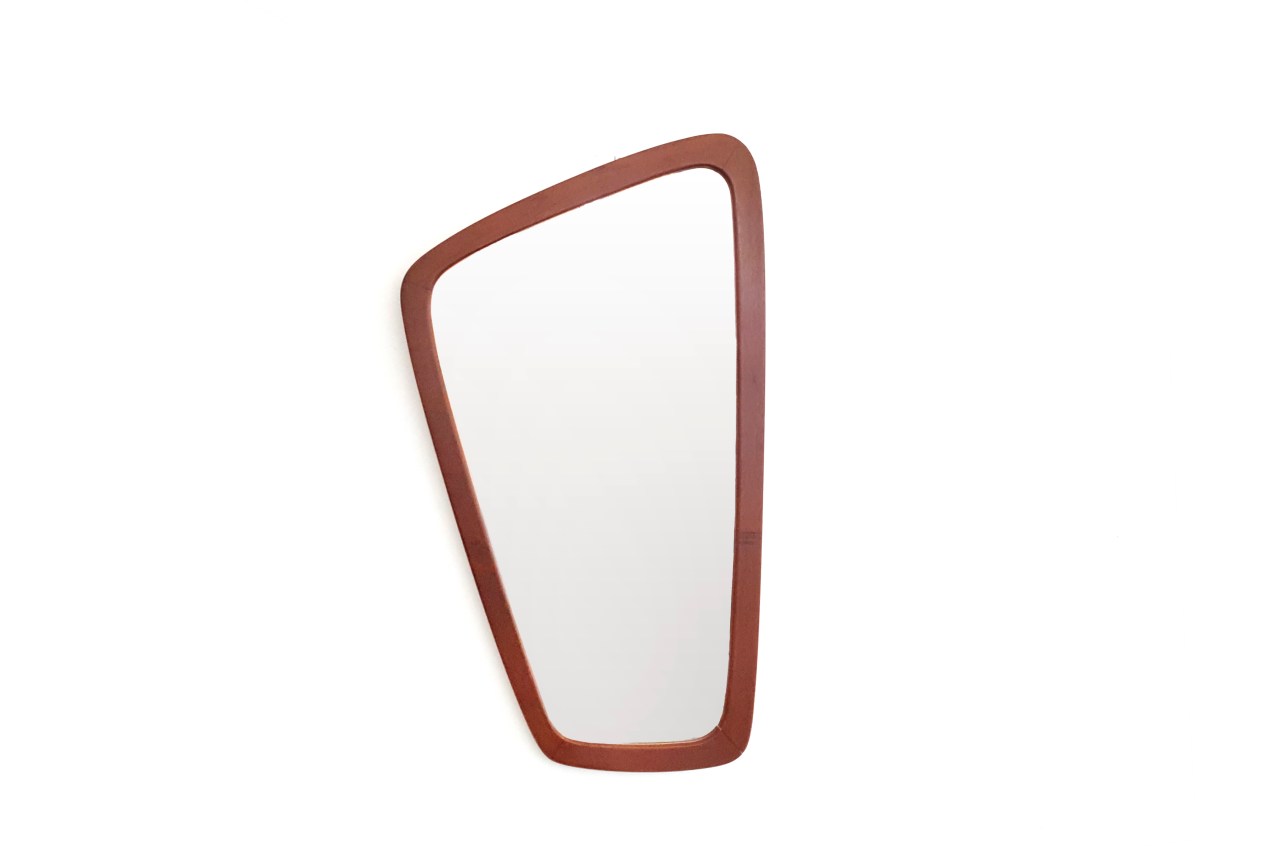 Omschrijving: Mooie asymmetrische Deens design spiegel gemaakt van massief teakhout. Deze spiegel heeft een typische mid century modern vormgeving waarbij er gedacht werd dat deze vorm een hele futuristische uitstraling had. Vandaag de dag doet dit ons juist denken aan de jaren 60. Deze spiegel is 69 cm hoog en op zijn breedst 39 cm breed.