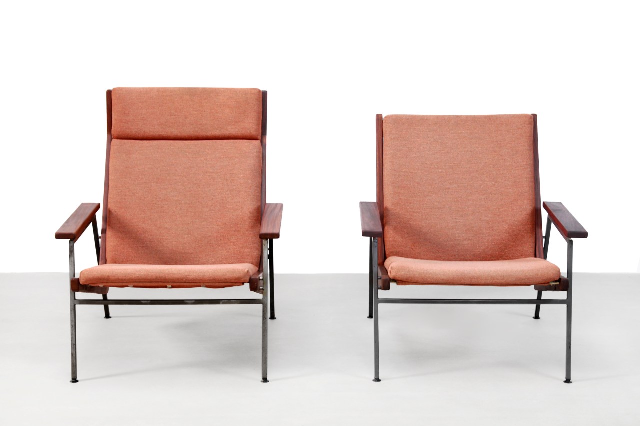 Omschrijving: Een set van twee ‘Lotus’ fauteuils ontworpen door Rob Parry voor Gelderland. De fauteuils zijn gemaakt van een gelakt stalen onderstel, massief teakhouten frame, rubberen singels en gestoffeerde schuimrubberen kussen. De kussens zijn gestoffeerd met een zeer mooie stof welke bestaat uit twee kleuren draden, namelijk zalm oranje rood en donker groen wat een prachtig effect geeft. De gemêleerde stof is 100% wol en de bekleding is door ons gewassen. Deze twee iconen hebben een prachtig Nederlands minimalistisch ontwerp. De fauteuils zijn 84 en 74 cm hoog, 69 cm breed en 75 cm diep.