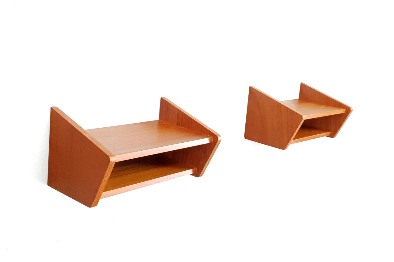 Omschrijving: Zeer mooie minimalistische nachtkastjes uit Denemarken gemaakt van teak. De kastjes worden blind bevestigd aan de muur en hebben beiden een open vakje. Door deze manier van ophangen, lijkt het bijna of de kastjes zweven. Door het tijdloze design passen deze kastjes goed in elke slaapkamer. De kastjes zijn 30 cm breed, 20 cm diep en 16 cm hoog.
