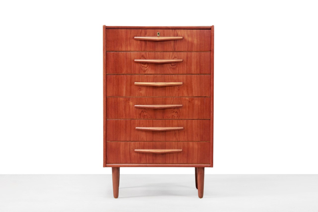 Omschrijving: Deens design ladekast met 6 lades. Uitgevoerd in teak hout met prachtig vormgegeven greepjes. Deze ladenkast komt uit de jaren 60 uit Denemarken. Gebruik deze kast voor in de gang, voor in de slaapkamer voor je sokken en je ondergoed, of eventueel als commode. De kast is 69.5 cm breed, 40 cm diep en 110 cm hoog.