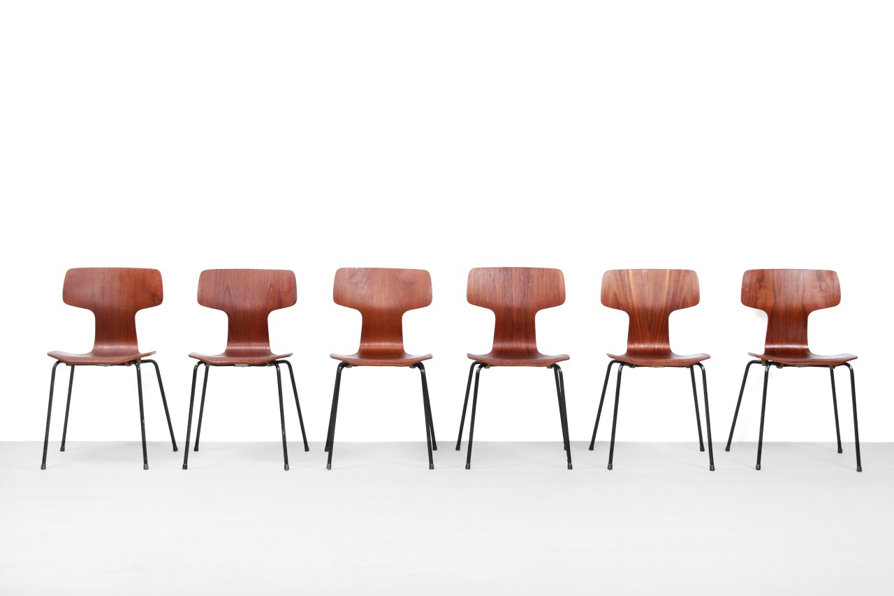 Omschrijving: Set van zes vroege Hamer stoelen ontworpen door Arne Jacobsen voor Fritz Hansen. De officiële naam van de stoelen is ‘stoel 3103’, maar ze worden doorgaans ‘the hammer chair’ genoemd. Bijzonder aan deze stoelen zijn de onderstellen met zwart omtrokken plastic, dit in combinatie met het merkje op de onderzijde bewijst dat deze set uit het einde van de jaren 50 komt. Bijzonder aan dit model is, is dat deze niet meer geproduceerd worden door Fritz Hansen. Je haalt hiermee dan ook een minder voorkomend en uniek design van Arne Jacobsen in huis. De stoelen zijn in totaal 78 cm hoog, 41 cm breed en 40 cm diep. De zithoogte van de stoelen is 44 cm.