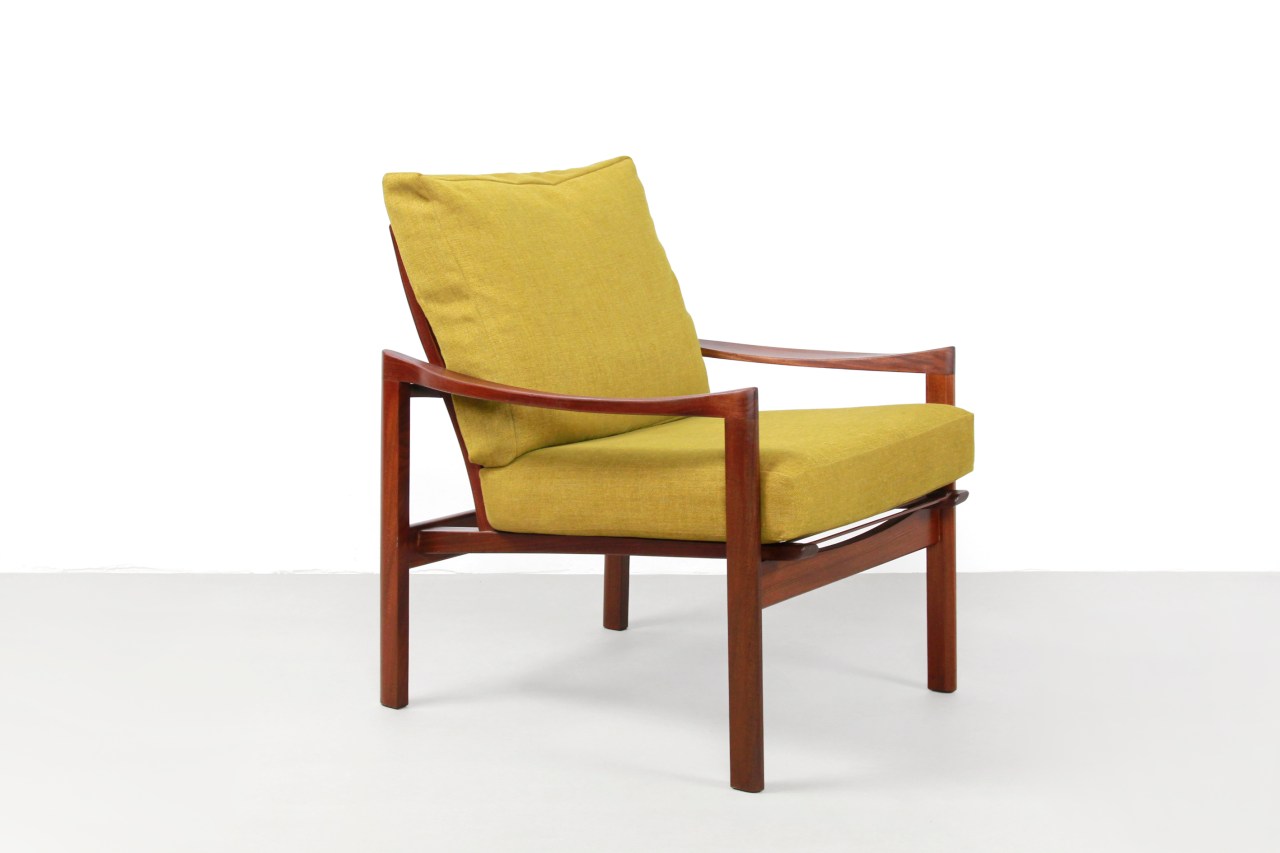 Omschrijving: Mooie teakhouten fauteuil met organische vormgeving. De lijnen van dit stoeltje zijn een lust om te zien. De kussens zijn opnieuw gestoffeerd met een prachtige meubelstof welke zowel gele als groene draden bevat, waardoor de kleur met elk lichtval anders is. Soms is het bijna goudkleurig. Het rugkussen heeft een donsveren inhoud waardoor hij erg comfortabel zit. Wij geloven dat deze fauteuil van een noemenswaardige fabrikant afkomstig is, gezien de kwaliteit en de mooie vormgeving, deze fauteuil vertoont in ieder geval gelijkenis met de ontwerpen van Illum Wikkelso voor Niels Eilersen, of die van Ole Wanscher. Dat je er een mooi stuk mee in huis haalt is in ieder geval zeker! Deze fauteuil is 70 cm breed, 70 cm diep en 80 cm hoog. De zithoogte is 45 cm, wat deze fauteuil uiterst geschikt maakt voor de wat langere mensen.