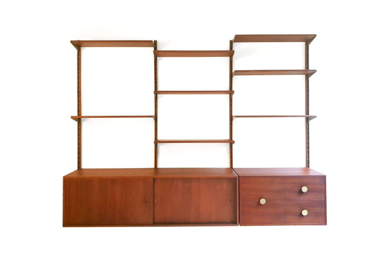 Omschrijving: Prachtig teak houten wandmeubel ontworpen door Finn Juhl en gemaakt door Bovirke Denemarken, in de jaren vijftig. Dit wandsysteem heeft een dressoir met twee schuifdeuren, een ladenblok met messing knoppen en 8 planken. De planken zijn prachtig vormgegeven met afgeronde randen en worden opgehangen aan massief messing staanders, welke gemakkelijk in de staanders te plaatsen zijn. Dit maakt dit wandmeubel eenvoudig naar uw smaak te verstellen.
