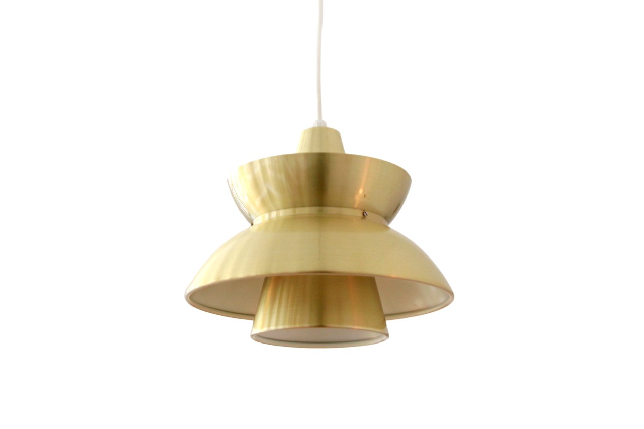 Omschrijving: Te gekke lamp van Jorn Utzon voor Nordisk Solar. Jorn Utzon is wereldberoemd geworden als architect van het operahuis in Sydney. De ‘Søværnspendel’, wat vertaald Marine lamp betekent, is uitgevoerd in een messing / goudkleurig aluminium. Deze lamp is 26 cm hoog en heeft een diameter van 28 cm.