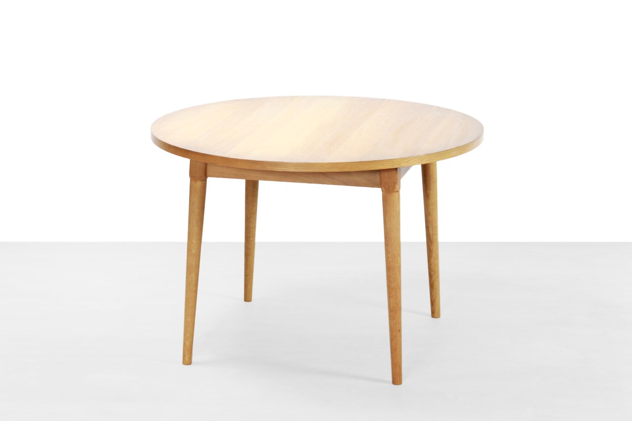 Omschrijving: Ronde eetkamertafel uit de jaren 60 gemaakt van massief eiken houten conische pootjes en een eiken gefineerd blad. De tafel komt uit Nederland maar is helaas niet gemerkt of teruggevonden in de catalogi die wij hebben. De tafel is 112 cm in diameter en 73 cm hoog.