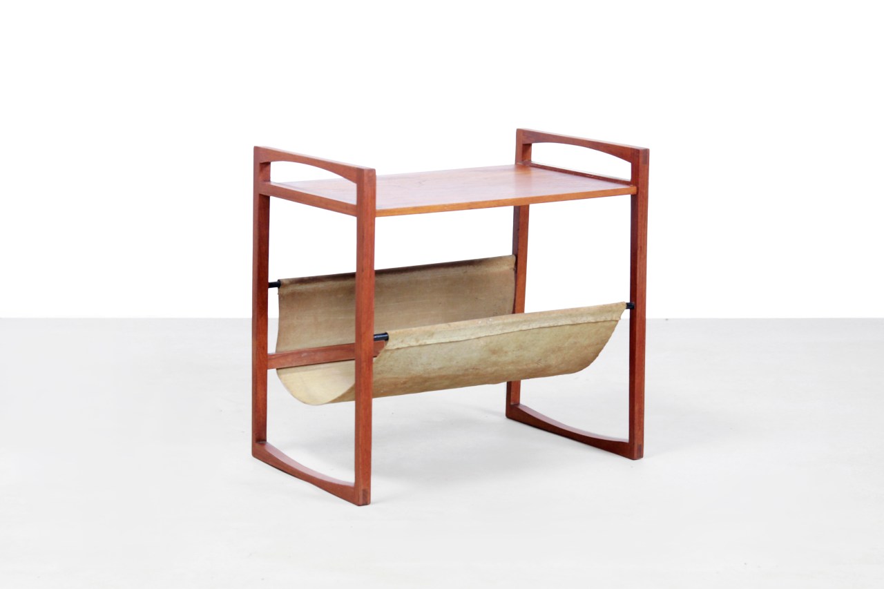 Omschrijving: Deense design magazine rack en bijzettafel ontworpen door Kai Kristiansen voor Sika Møbler. Het onderste compartiment voor tijdschriften is gemaakt van suède. Het tafeltje is gemaakt van massief teak en heeft prachtige details. Kijk bijvoorbeeld naar de hout verbindingen in elke hoek. Uitzonderlijk mooi slank tafeltje voor bijvoorbeeld naast een bank of fauteuil, of ook heel goed te gebruiken als nachtkastje. Dit tafeltje is 47 cm breed, 30 cm diep en 45 cm hoog.