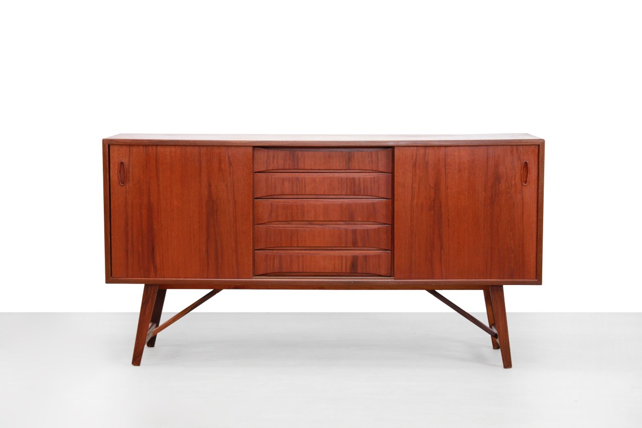 Omschrijving: Stijlvolle Deens design dressoir gemaakt van massief teak en teak fineer. De vier lades zijn erg mooi afgewerkt in de stijl van Arne Vodder en de twee schuifdeuren hebben teak ingelegde greepjes. Achter de schuifdeuren zijn links twee en rechts één plank te vinden. Ook de pootjes hebben een mooi design zoals we dit kennen van Borge Mogensen. Helaas weten wij niet wie dit dressoir heeft ontworpen, maar dat het kwalitatief is, zie je er vanaf. Het dressoir is 150 cm lang, 39,5 cm diep en 80 cm hoog.