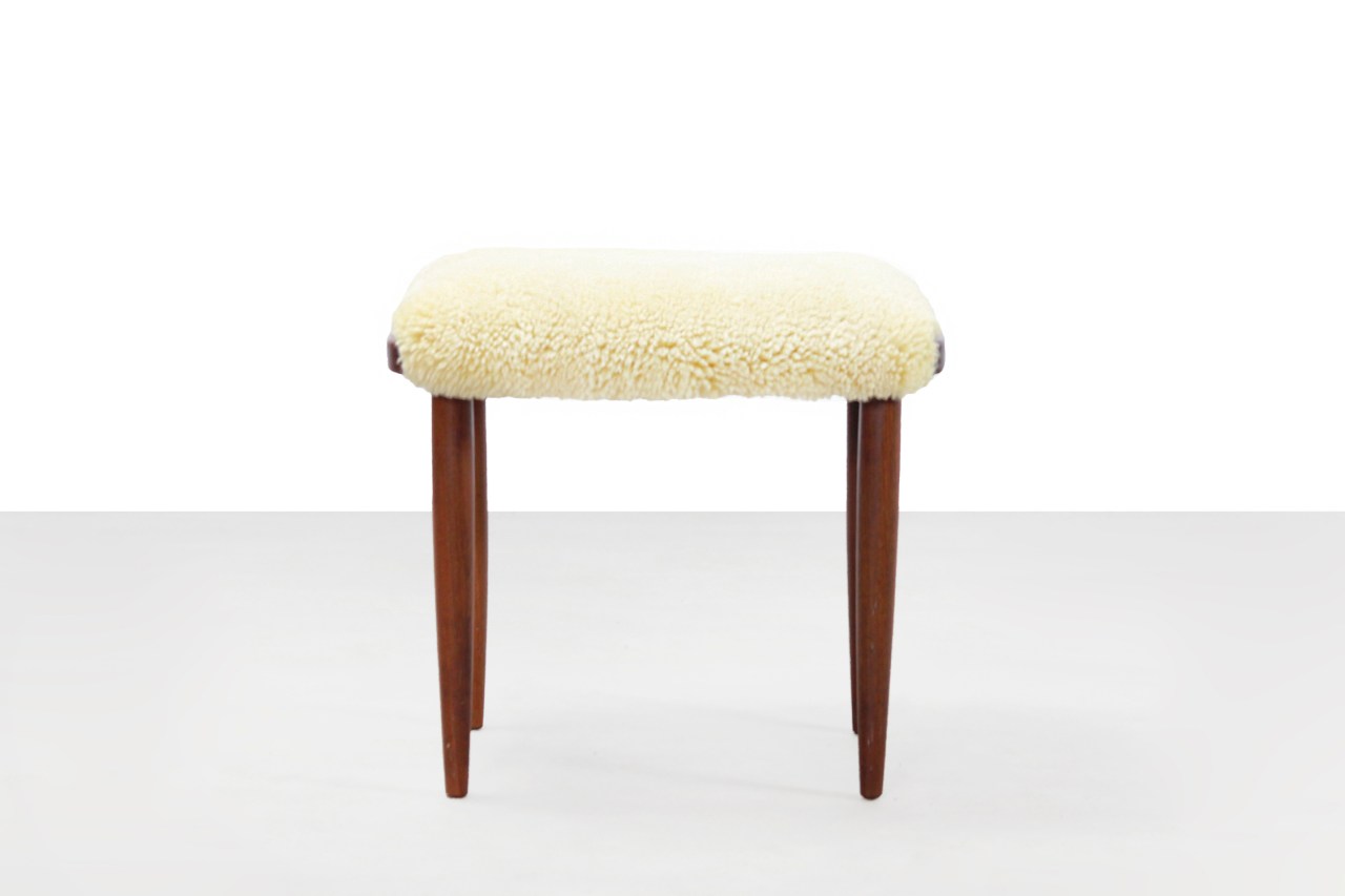 Omschrijving: Deens voetenbankje gestoffeerd in echt schapenvacht. De poten en de zijkanten zijn gemaakt van massief teak hout. Goed te combineren bij elke fauteuil of los te gebruiken als krukje.