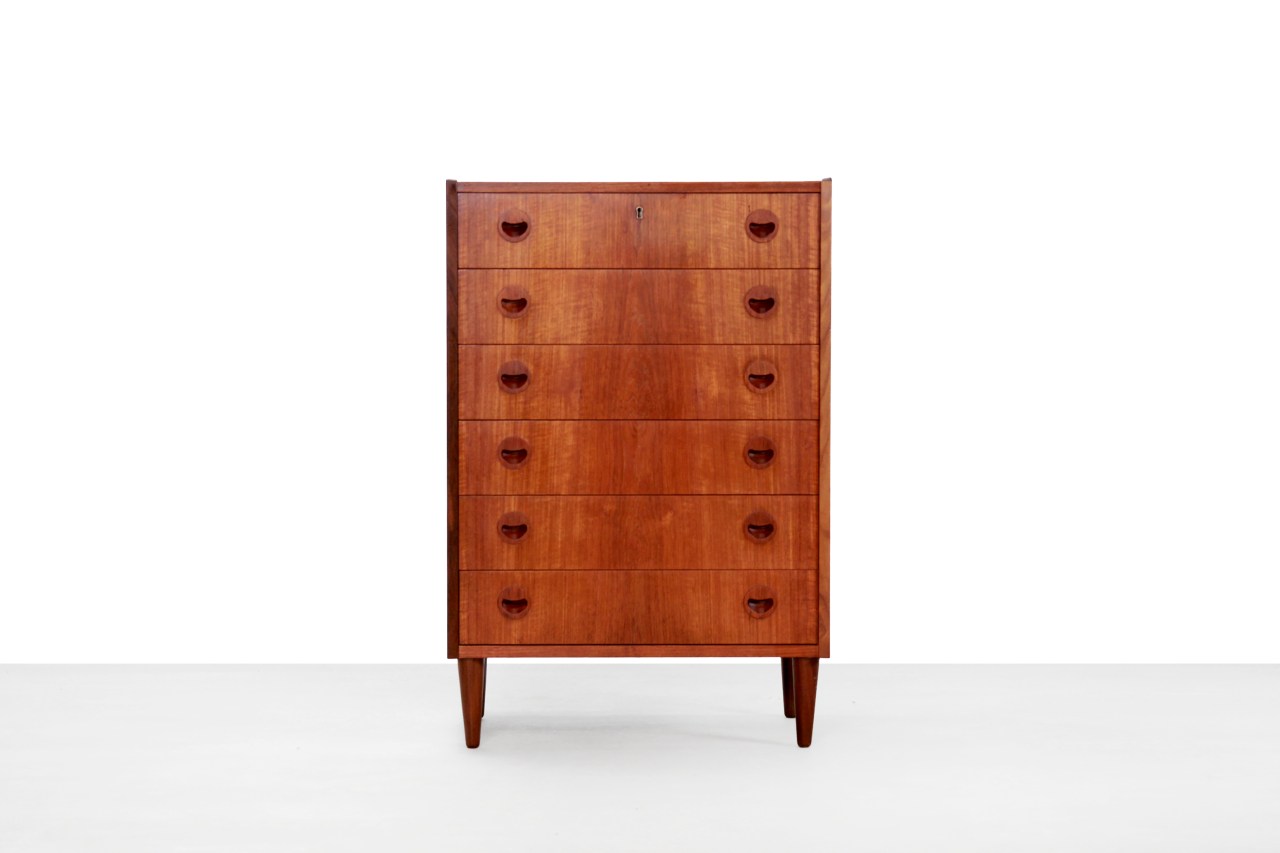 Omschrijving: Deens design ladekast met 6 lades. Uitgevoerd in teak hout met prachtige ronde greepjes. Deze ladenkast komt uit de jaren 60 uit Denemarken. Gebruik deze kast voor in de gang, voor in de slaapkamer voor je sokken en je ondergoed, of eventueel als commode. Deze kast is 67 cm breed, 39 cm diep en 100 cm hoog.