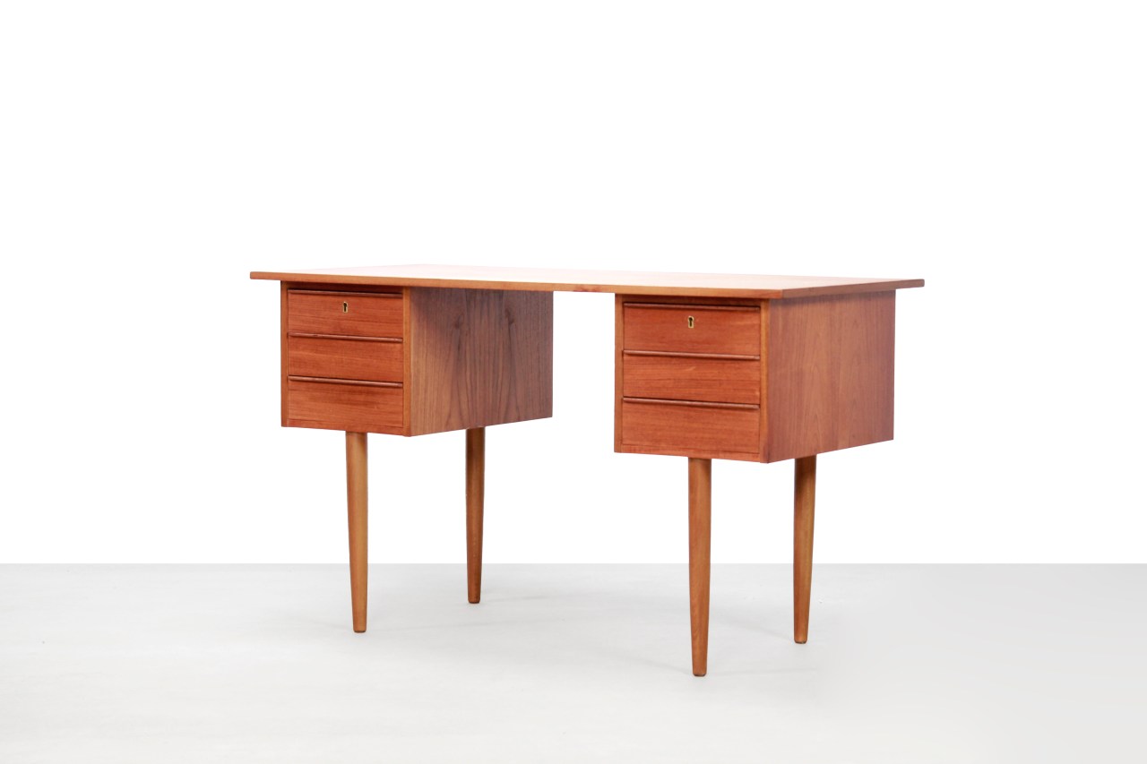 Omschrijving: Stijlvol simpel Deens design bureau gemaakt van teakhout. Prachtige slanke pootjes waardoor het bureau niet veel ruimte in lijkt te nemen. Drie lades aan beide kanten. Een heel handig bureautje voor als je niet al te veel ruimte hebt of voor bijvoorbeeld een tienerkamer. Het bureau is 120 cm breed, 70,5 cm hoog en 58,5 cm diep.