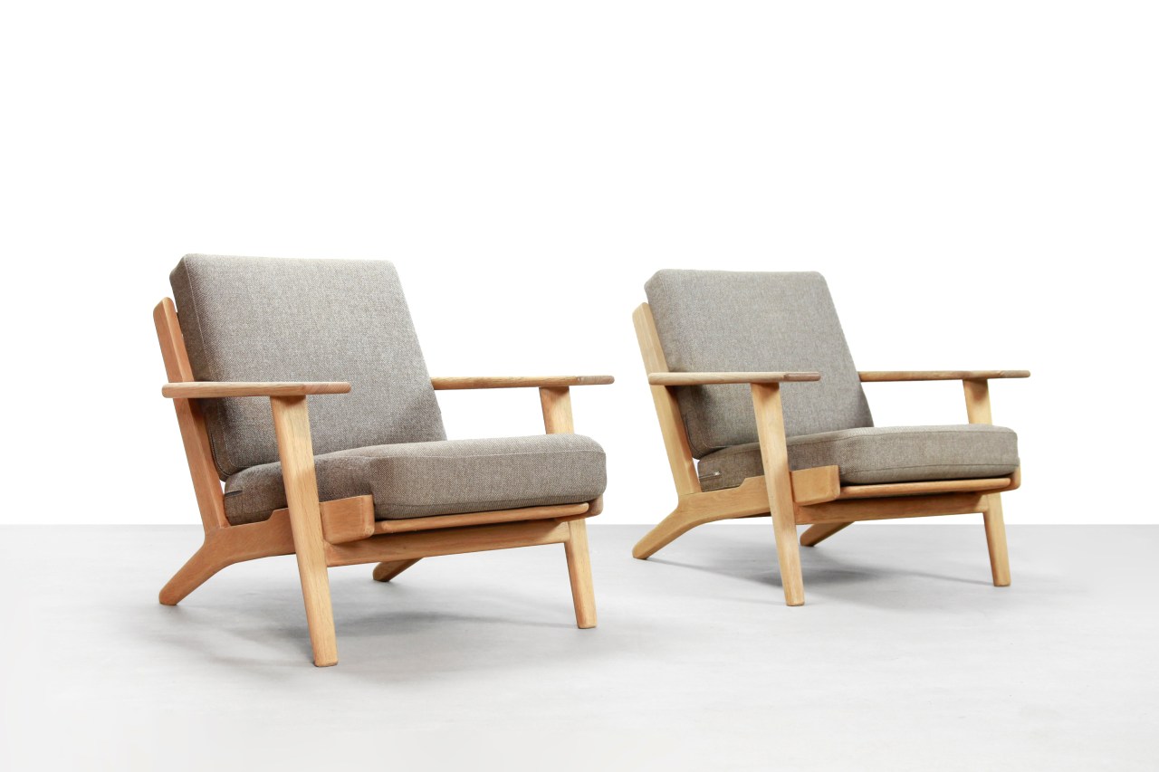 Omschrijving: Prachtige set design fauteuils van bekende Deense ontwerper Hans Wegner. Hans Jørgen Wegner zijn ontwerpen stralen puur vakmanschap uit en kenmerkend is de minimalistische vormgeving. Deze icoon krijgt gelukkig ook een steeds grotere bekendheid in Nederland. En niet voor niets, Wegner ontwerpt super kwalitatieve meubels met een Deense elegantie zoals alleen Wegner dat kan. Deze fauteuil is gemaakt van massief eikenhout en is gestoffeerd in Kvadrat Hallingdal nummer 270 met twee kleuren draad namelijk grijs en bruin. Deze duurzame stof is ontworpen door Nanna Ditzel. Deze fauteuils zitten heerlijk, zijn onverwoestbaar en ook nog eens prachtig en zijn 75 cm breed, 78 cm diep en 70 cm hoog, met een zithoogte van 39 cm.