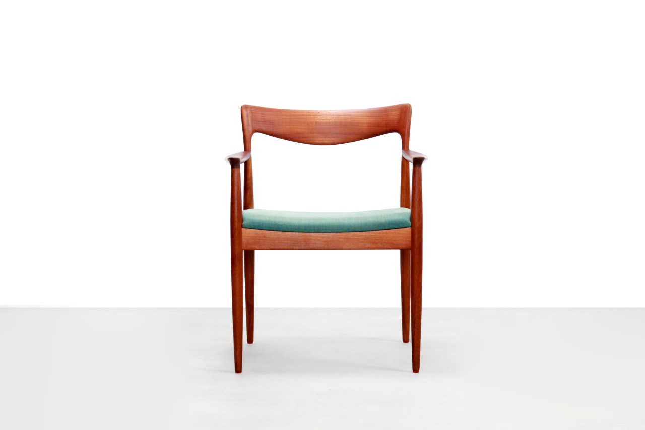 Omschrijving: Elegante en zeer mooi vormgegeven stoel ontworpen door Arne Vodder en geproduceerd door Vamo Mobelfabrik uit Sonderborg, Denemarken. Deze organische stoel is gemaakt van massief teakhout en bekleed met een mooie wollen turquoise stof. Dit soort modellen noemen ze in Denemarken ‘Kontorstol’, wat een luxe bureau fauteuil is die bij een statig bureau hoort. Natuurlijk kan deze stoel ook als hoge fauteuil gebruikt worden in de woonkamer, of aan de eetkamertafel. Deze stoel is echt bijzonder mooi gemaakt, let bijvoorbeeld ook op het detail bij de armleuningen. De stoel is 64 cm breed, 50 cm diep en 77 cm hoog. De zithoogte van de stoel is 45 cm.