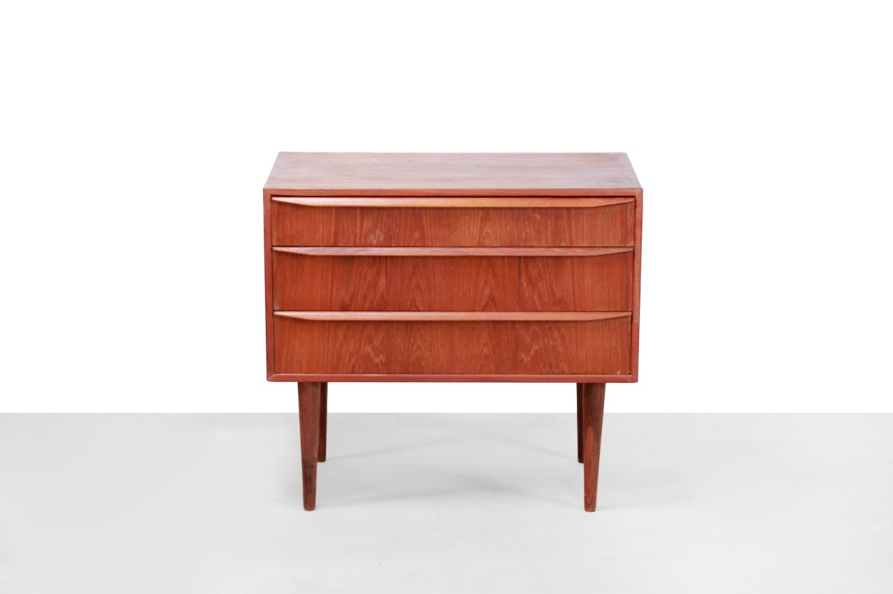 Omschrijving: Deens design ladekast met drie lades met prachtige greepjes die over de breedte van de lades doorlopen. De vormgeving van het kastje is modernistisch, recht en zonder poespas. Dit maakt het kastje een tijdloos model. Fijn formaat die je op meerdere plekken in het huis kwijt kunt.