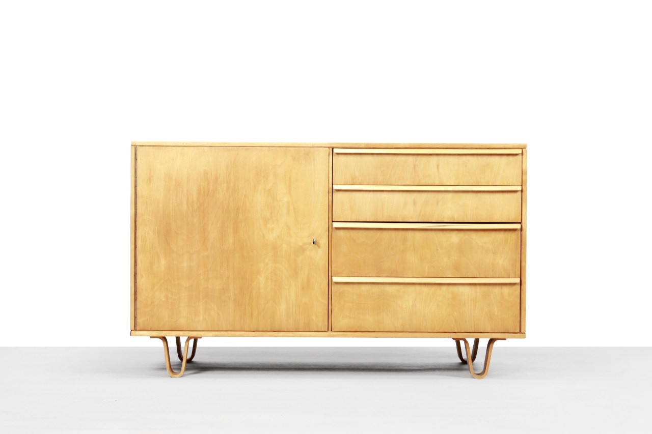 Omschrijving: Zeldzaam dressoir uit de Berkenserie van Cees Braakman voor Pastoe. Het dressoir heeft 1 deurtje en 4 lades en is volledig gemaakt van berkenhout. Iconisch zijn de bekende plywood luspoten en de gebogen anti-dust-lades. Deze DB01 kom je niet veel tegen. Het PasToe sideboard is 131 cm breed, 48 cm diep en 80 cm hoog.