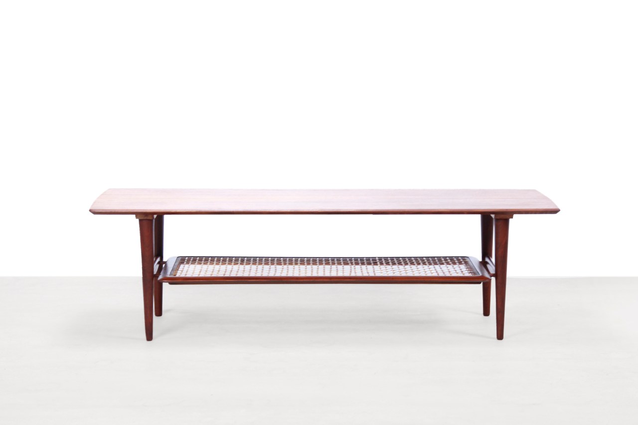 Omschrijving: Mooie Nederlandse design salon tafel gemaakt van massief teakhouten onderstel en een teak gefineerd blad. Onder het tafelblad is er een bijna zwevende plank gemaakt van geweven rotan voor bijvoorbeeld magazines. Deze tafel heeft een extra lang formaat, wat deze tafel uiterst geschikt maakt voor bijvoorbeeld een vierpersoons bank. De manier waarop deze tafel vormgegeven is heeft veel wel van de organische designs uit Denemarken. Deze tafel is afkomstig uit Nederland en is 150 cm lang, 40 c diep en 43 cm hoog.