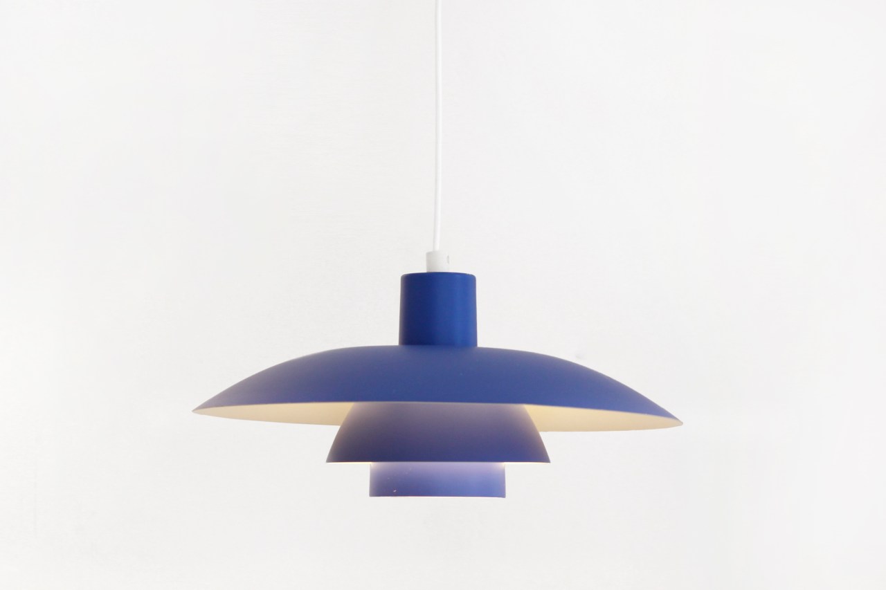 Omschrijving: Prachtige vintage design hanglamp van Poul Henningsen voor Louis Poulsen in Blauw. Deze lamp wordt de PH 4/3 genoemd. De lamp is zo ontworpen dat je een maximale verspreiding van het licht hebt en zo min mogelijk schittering in je ogen. De PH4/3 heeft een diameter van 40 cm en een hoogte van 20 cm. Wij hebben momenteel deze lamp ook in wit.