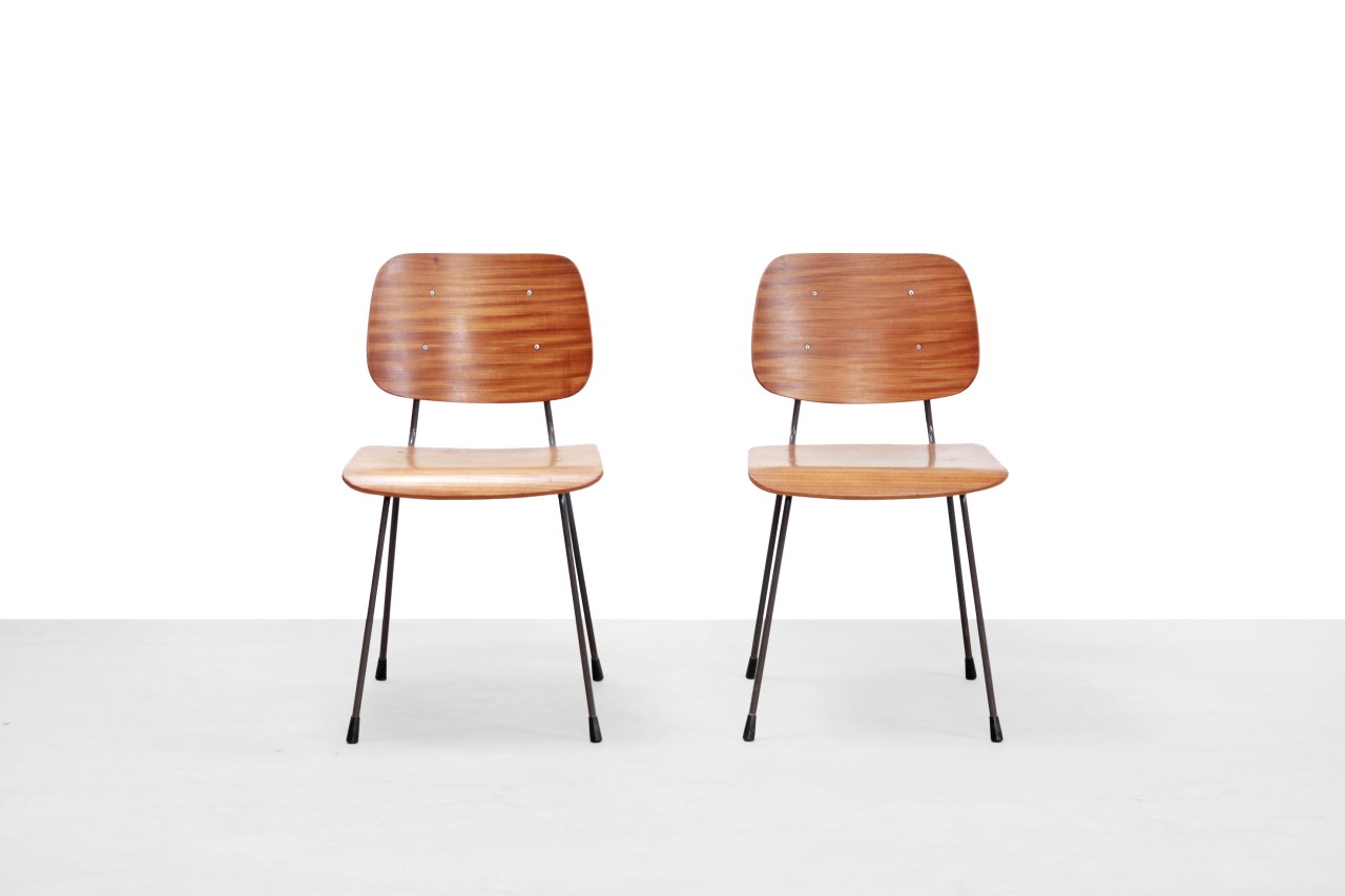 Omschrijving: Niet veel voorkomende stoelen ontworpen door Nederlands ontwerper Tjerk Reijenga voor Pilastro. Deze stoel heeft modelnummer 7004 en is gemaakt van een antreciet gelakt metalen frame en teak plywood zittingen en rugleuningen. Deze stoelen kun je gebruiken als toevoeging aan de eetkamertafel, maar bijvoorbeeld ook als bureaustoel. Heel gaaf bijvoorbeeld als je ook een Tjerk Reijenga wandsysteem met bureau element hebt. De stoelen zijn 80 cm hoog, 45 cm breed en 50 cm diep. Ze hebben een zithoogte van 44 cm.