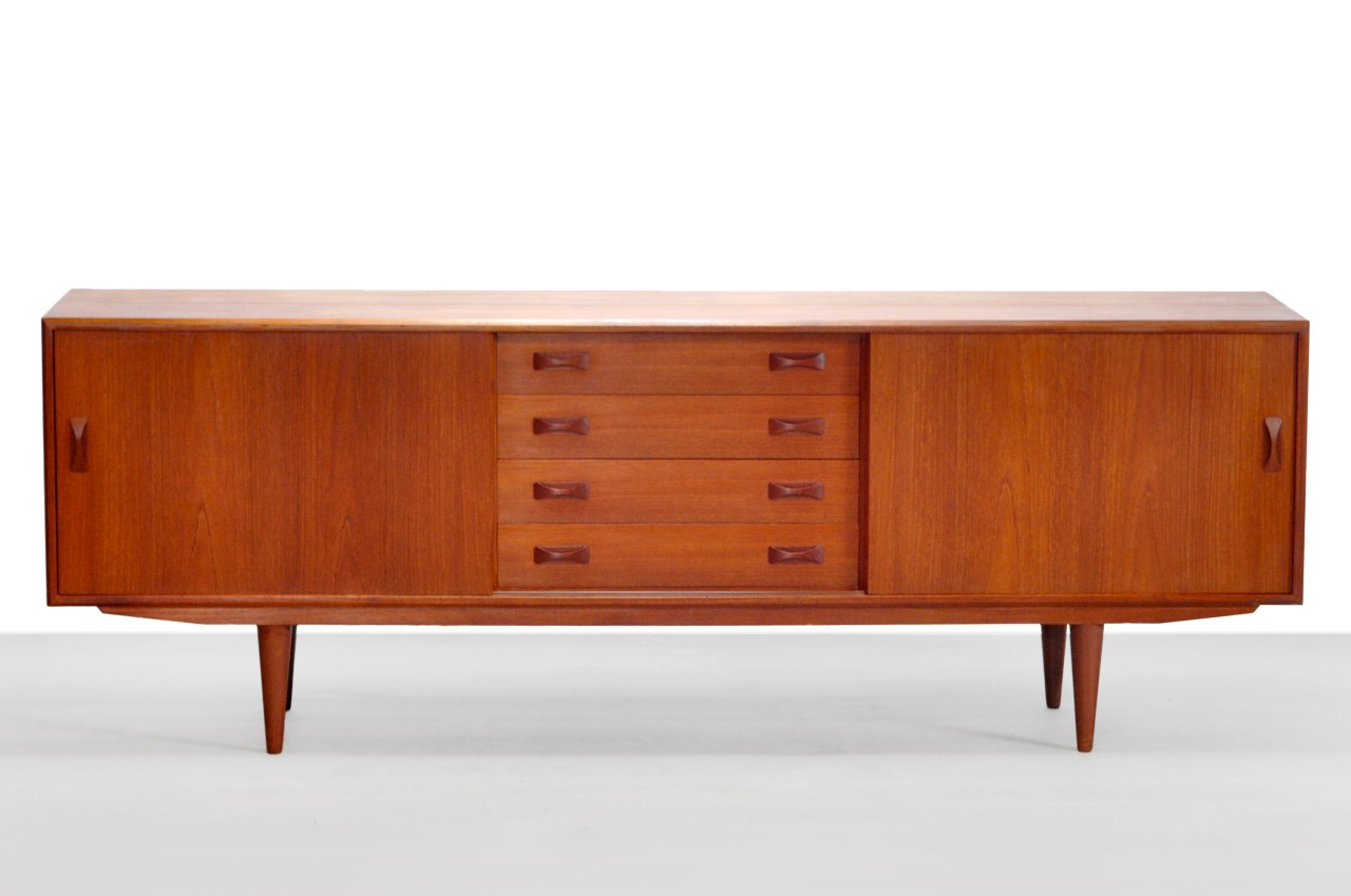 Omschrijving: Zeer mooi en breed dressoir geproduceerd door Deense fabrikant Clausen & Son uit Silkeborg. Dit dressoir is gemaakt van teakhout. Dit dressoir is zeer mooi afgewerkt, zo lopen de randen van de deuren of de gehele kast mooi rond af. Het dressoir heeft twee schuifdeuren en vier lades, en staat op slanke conische pootjes. Dit dressoir heeft een lengte van wel 209 cm. Het dressoir is 45 cm diep en 74 cm hoog.