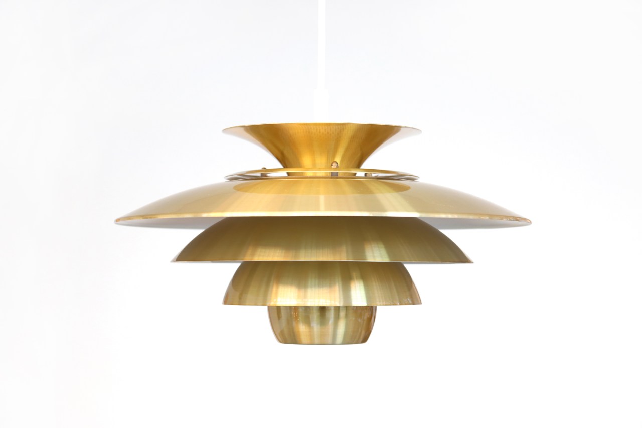 Omschrijving: Mooie vintage Deens design hanglamp in de stijl van Jo Hammerborg. Dit model is gemaakt van aluminium en heeft een goudkleurige coating waardoor het lijkt op messing. De lamp bestaat uit 4 laagjes en is een mooie alternatief voor een Louis Poulsen of Fog and Morup lamp. De lamp is ongeveer 27 cm hoog en heeft een diameter van 40 cm.