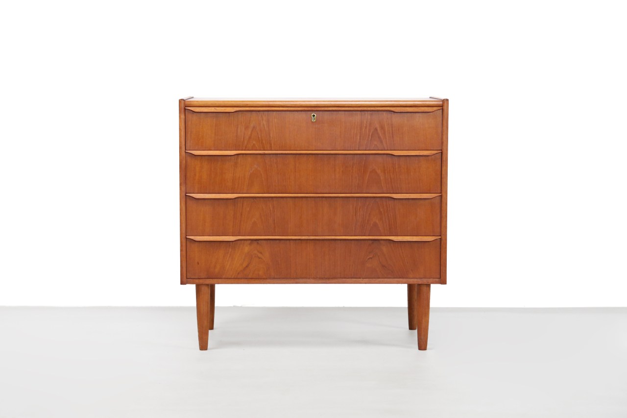 Omschrijving: Mooie Deens design ladekast met 4 lades. Uitgevoerd in teak fineer en massief teakhouten greepjes en pootjes. De vormgeving van de greepjes maken dit kastje een plaatje om te zien. Deze kast is 75,5 cm breed, 40 cm diep en 72 cm hoog.