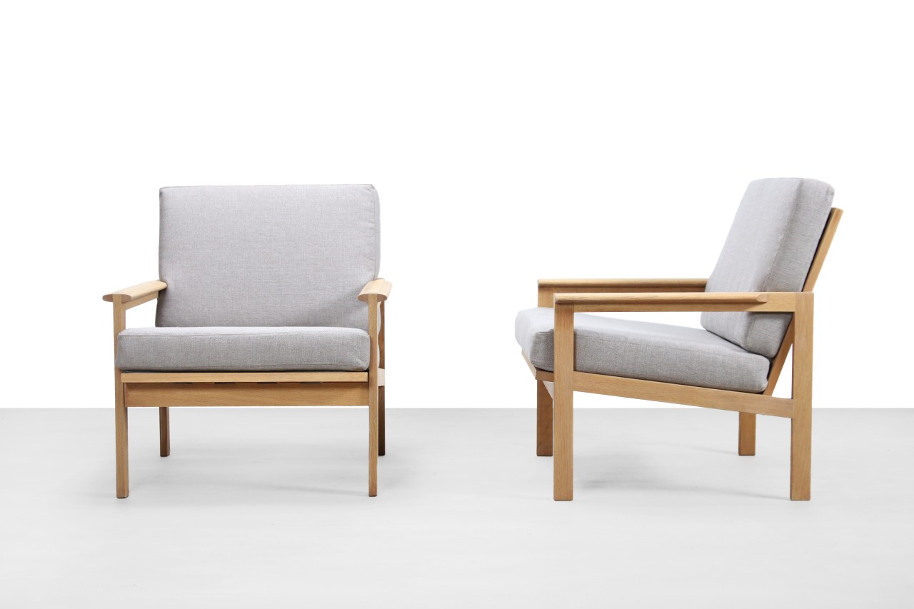 Omschrijving: Een paar massief eiken houten fauteuils ontworpen door Illum Wikkelsø, en geproduceerd door Niels Eilersen in Denemarken. Deze fauteuils met modelnaam no 4 Capella komen uit het eind van de jaren 50.