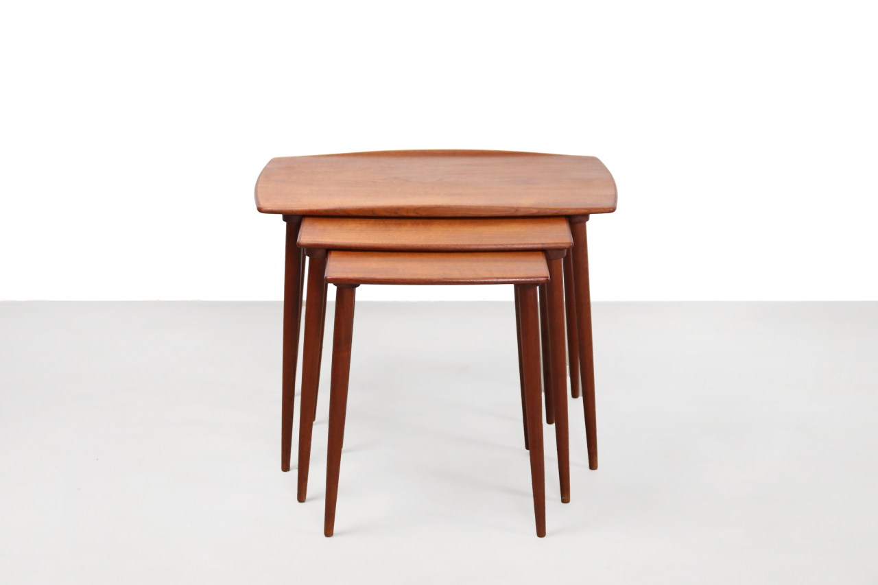 Omschrijving: Zeer mooie nesting tafels ontworpen door Jens Harald Quistgaard en geproduceerd door R Nissen uit Denemarken. De bijzettafels zijn gemaakt van teak hout en zeer mooi afgewerkt. De tafels passen onder elkaar en zijn handig om te gebruiken als bijzettafels, als salontafel, maar bijvoorbeeld ook als nacht tafeltjes naast het bed.