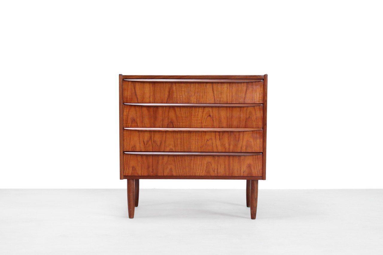 Omschrijving: Mooie Deens design ladekast met 4 lades. Uitgevoerd in teak fineer en massief teakhouten greepjes en pootjes. De vormgeving van de greepjes maken dit kastje een plaatje om te zien. Deze kast is 79 cm breed, 39 cm diep en 80 cm hoog.