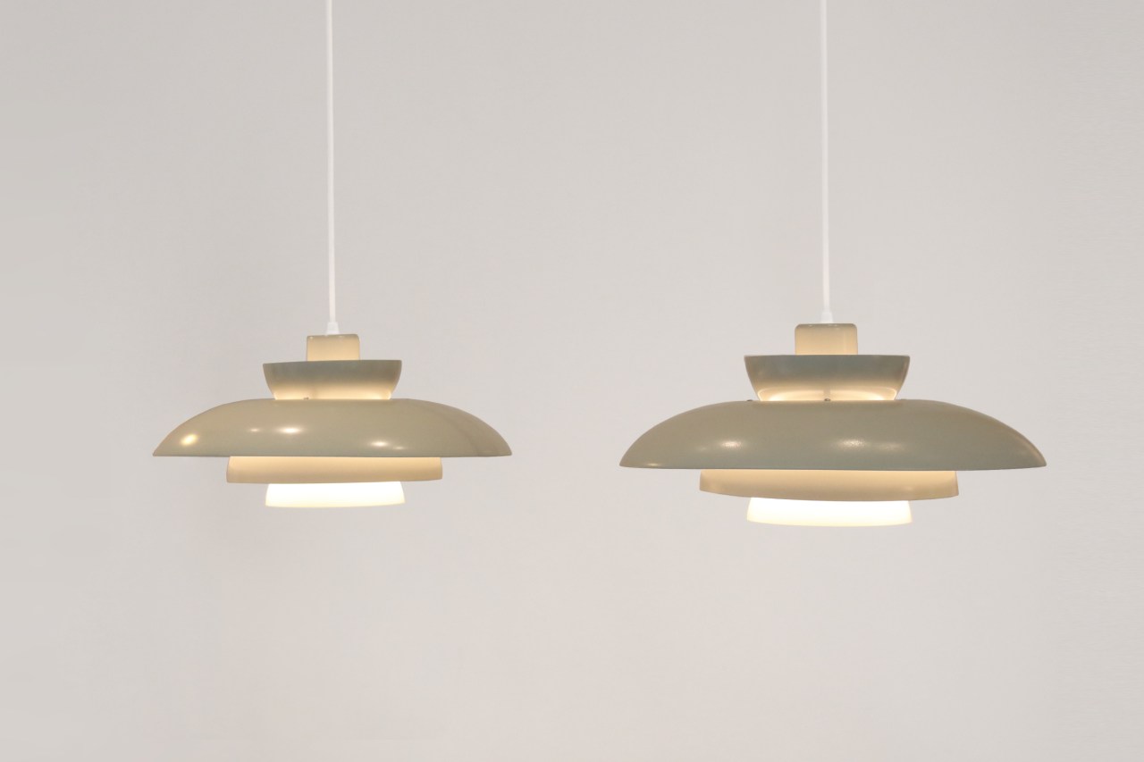 Omschrijving: Twee Deens design lampen ontworpen door inmiddels bekende designer Jo Hammerborg en geproduceerd door Fog & Mørup. De lampen zijn gemaakt van grijs gelakte aluminium schalen met een witte binnenkant. Mooi ontwerp van Hammerborg met een knipoog naar de bekende PH5 van Poul Henningsen. Mooi als set, maar ook los te koop.