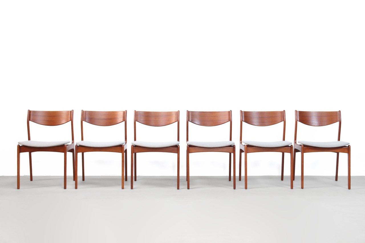 Omschrijving: Mooie set eetkamerstoelen ontworpen door Erik Buch uit Denemarken. Erik Buch is vooral bekend geworden door zijn barkrukken, en heeft ook deze geweldige organische stoelen gemaakt met een heerlijk zitcomfort. De stoelen zijn gemaakt van massief teak hout en de rugleuningen zijn van plywood met teak fineer. De stoelen zijn opnieuw bekleed met een grijs/crème gemêleerde meubelstof.