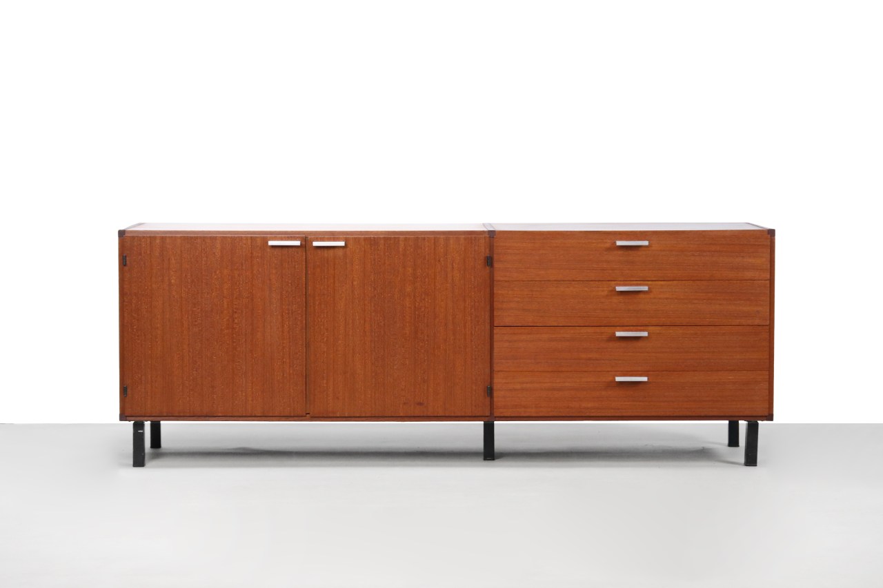 Omschrijving: Prachtig teakhouten dressoir ontworpen door Cees Braakman voor Pastoe. Dit dressoir komt uit de made to measure serie waarbij er gebruik is gemaakt van roestvrijstalen greepjes. Dit sideboard bestaat uit twee teakhouten deurtjes en 4 gebogen plywood ‘anti-dust’ lades. Dit dressoir is 178 cm breed, 46 cm diep en 65,5 cm hoog.