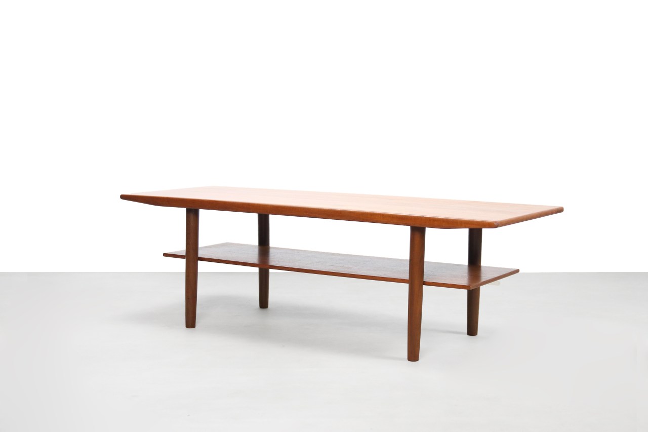 Omschrijving: Prachtige Deense mid century modern salontafel van teakfineer met massief teak houten rand en een extra blad voor bijvoorbeeld magazines.