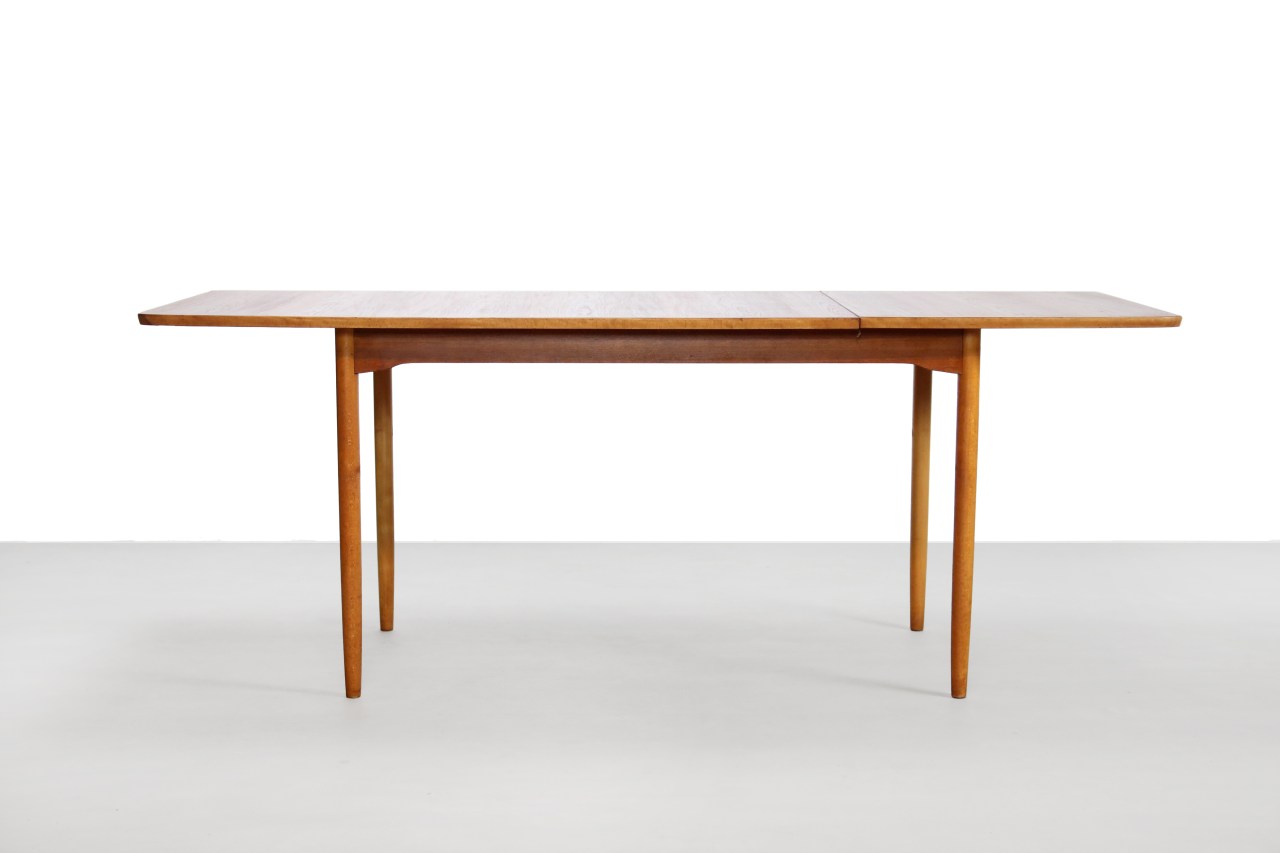Omschrijving: Prachtige teak houten tafel met beuken poten welke verlengbaar is door middel van een drop leaf blad. Door het blad omhoog te klappen en zijn geheel naar links door te schuiven, wordt de tafel zeer eenvoudig verlengd. Deze tafel is hetzelfde gemerkt als de Hans Wegner CH-30 stoelen en zijn ook als originele complete set gekocht. De stoelen worden afzonderlijk van de tafel te koop aangeboden.