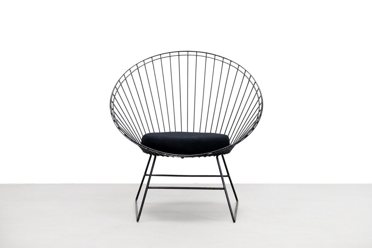 Omschrijving: Mooie zeldzame vintage draadfauteuil van Cees Braakman en Adriaan Dekker voor Pastoe in samenwerking met Tomado. Deze zwart metalen draadstalen fauteuil heeft een prachtige vormgeving welke je niet vaak ziet. Een echte eyecatcher in het interieur. Deze stoel kan zowel binnen als buiten gebruikt worden. De stoel is voorzien van een kussen welke bekleed is met zwarte wollen meubelstof. De fauteuil is 80 cm hoog, 77 cm breed en 60 cm diep.