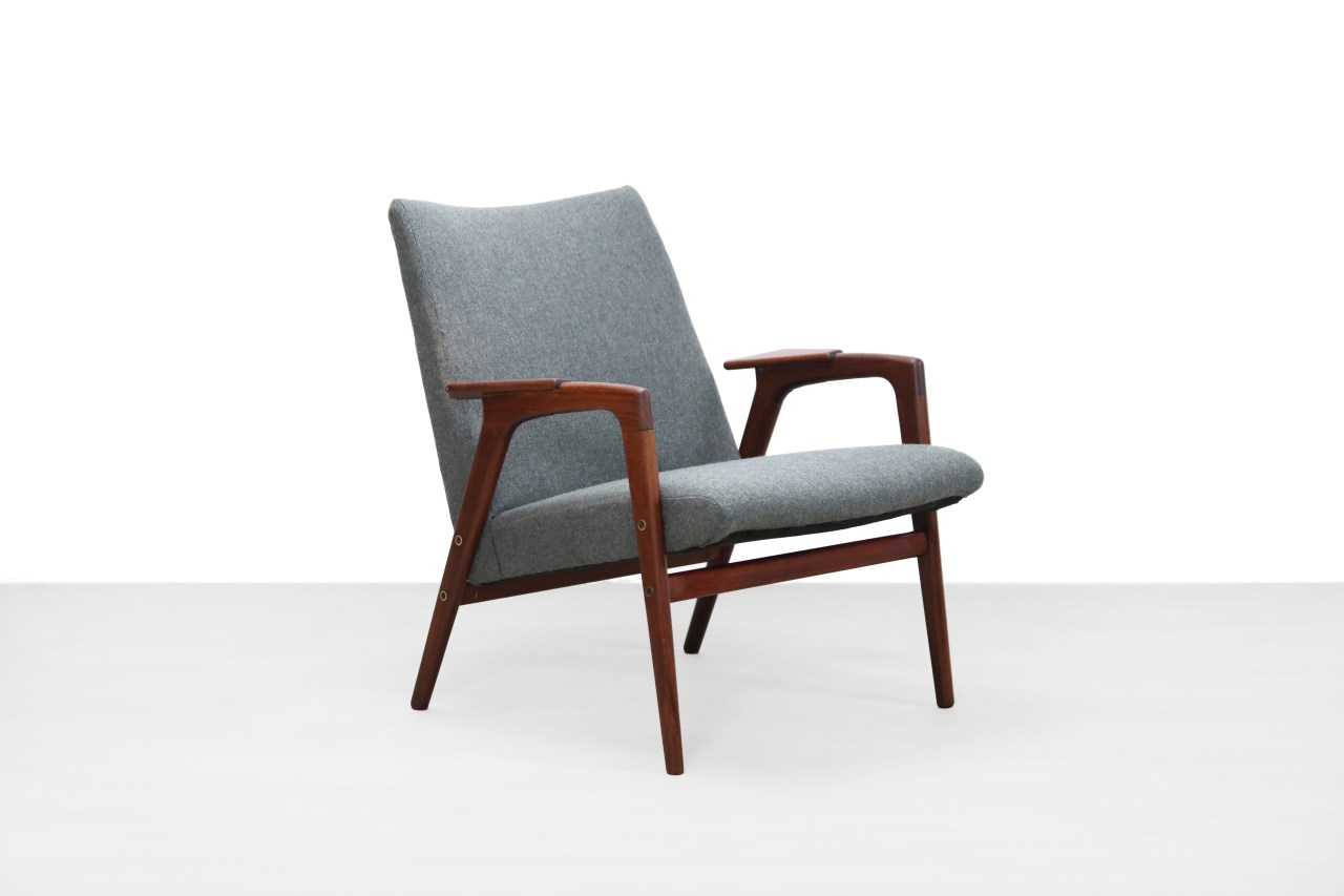 Deze elegante fauteuil is opnieuw gestoffeerd met een grijze wollen meubelstof van De Ploeg en het teak houten frame met schitterende driehoekige armleuningen zijn goed schoongemaakt en voorzien van een nieuwe laag olie.