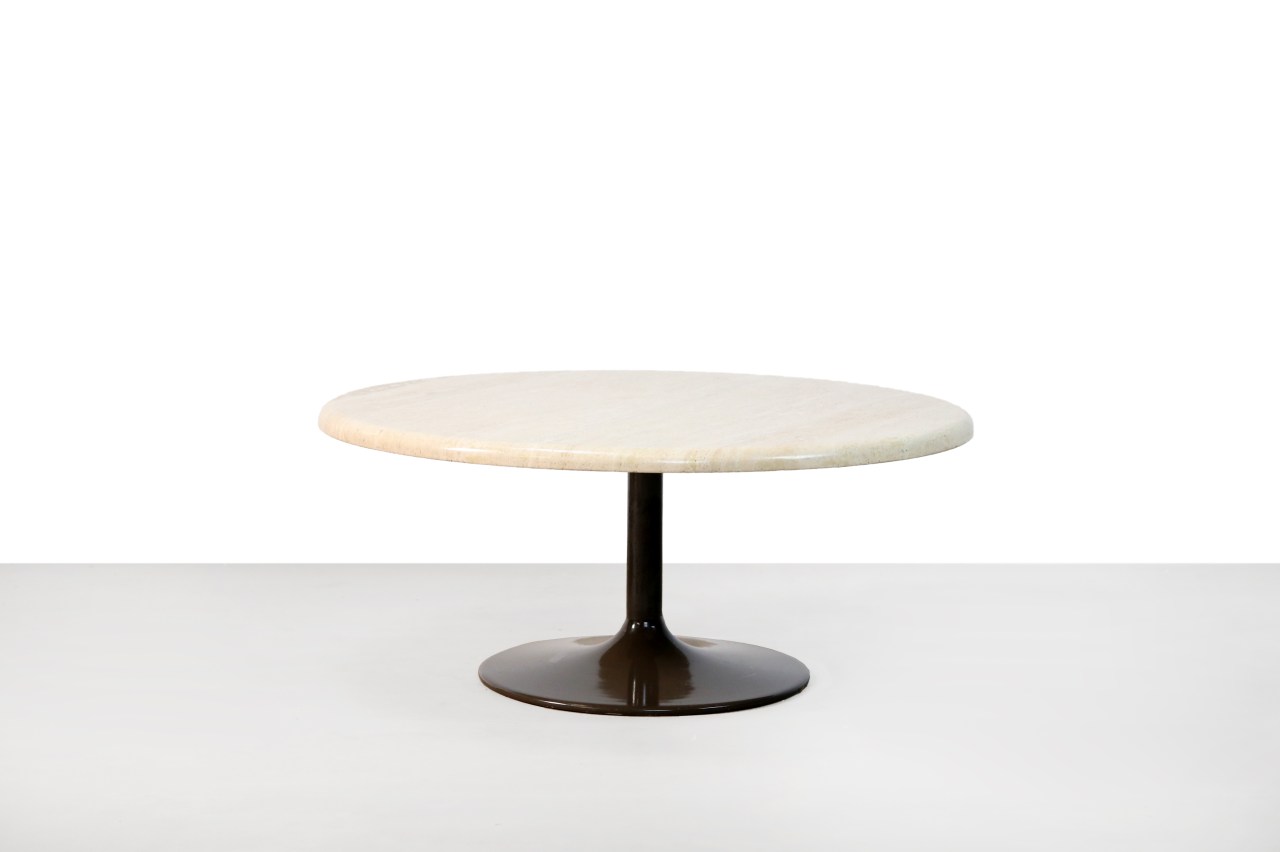 Omschrijving: Prachtige ronde salontafel van Italiaans Travertijn. Mooie massieve tafel op een donker bruin metalen tulip voet. Erg mooi op een donkere vloer of een donker vloerkleed. Kan ook zeer goed gebruikt worden als onderdeel van een groepje salontafels.