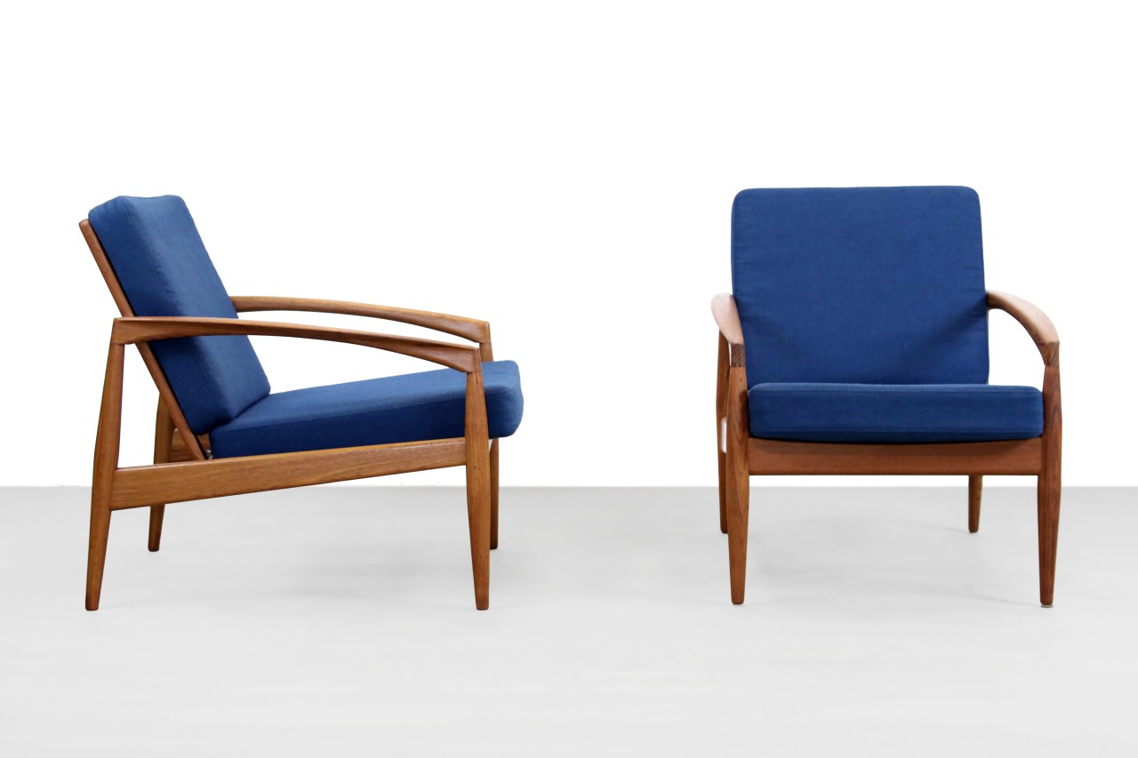 Omschrijving: Een prachtige set fauteuils ontworpen door Kai Kristiansen, geproduceerd door Magnus Olesen in Denemarken. Dit model, ‘Model 121’ wordt ook wel Paper Knife genoemd en is gemaakt van massief teak hout van zeer hoge kwaliteit. Het teakhouten frame is ontworpen met prachtige slanke lijnen en uitstekende details. Kijk bijvoorbeeld eens naar de armleuningen. Dit is echt vakmanschap. De kussens van deze fauteuil hebben nog de originele blauwe stof, welke grondig zijn schoongemaakt, en zijn voorzien van nieuw schuim. De fauteuils zijn 64 cm breed, 80 cm diep, 72 cm hoog en hebben een zithoogte van 41 cm. Desgewenst kunnen de fauteuils tegen bijbetaling opnieuw gestoffeerd worden in een kleur naar keuze.