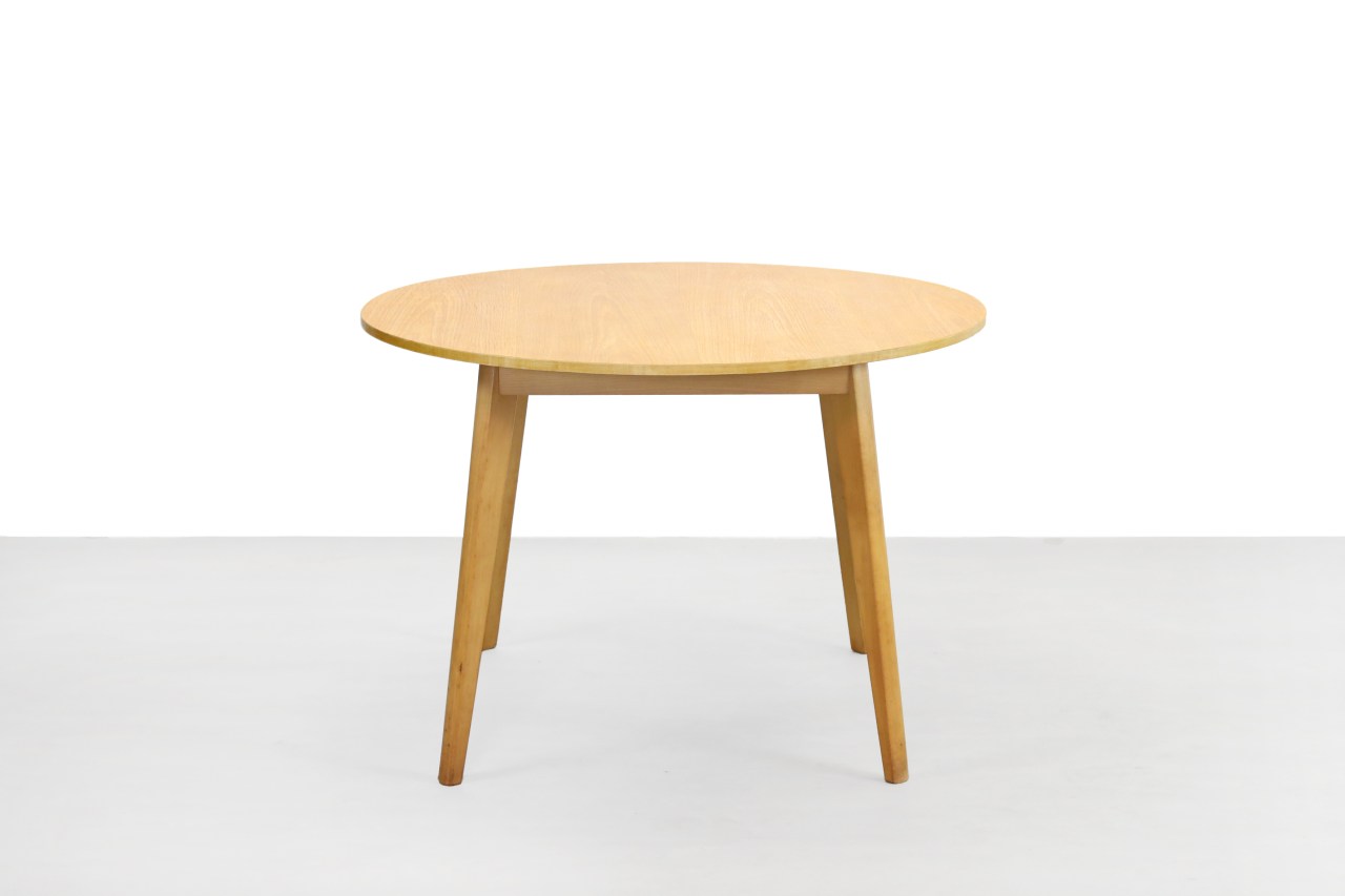 Omschrijving: Ronde eetkamertafel uit de jaren 60 gemaakt van beukenhout. De tafel komt uit Nederland maar is helaas niet gemerkt of teruggevonden in de catalogi die wij hebben. De tafel is 103 cm in diameter en 71 cm hoog.