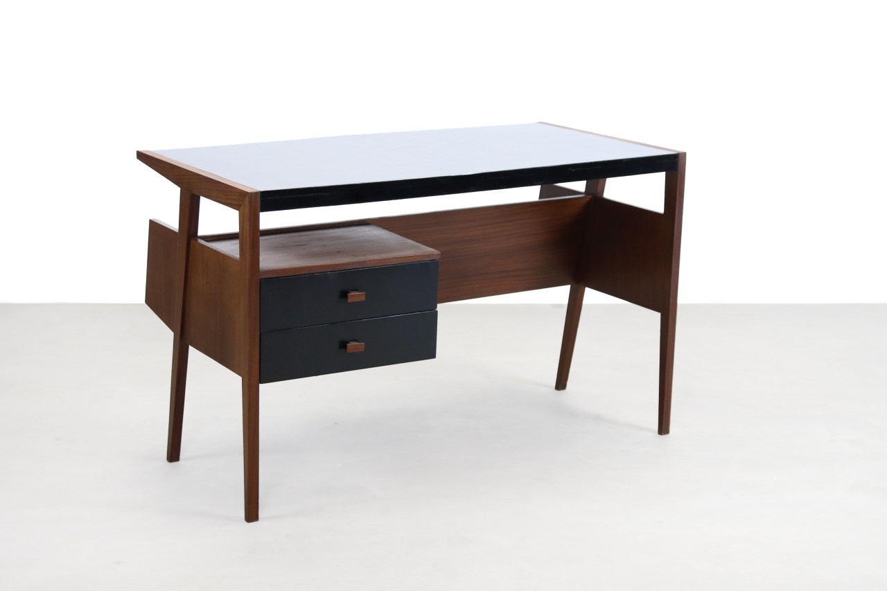 Omschrijving: Super gaaf bureau uit de jaren 60. Het bureau komt uit Nederland en is gemaakt van teakhout. Het blad is zwart gelakt net als de lades. Door het slimme ontwerp is het bureau zeer geschikt om in het midden van de ruimte te zetten. Aan de achterkant zit een groot vak voor bijvoorbeeld boeken. Het bureau is 120 cm lang x 62 cm diep x 74 cm hoog.