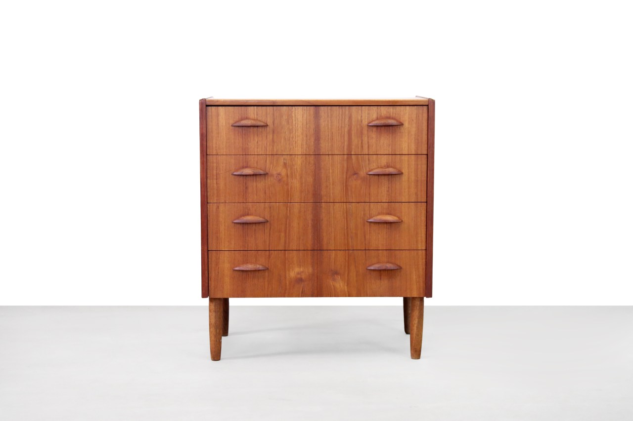 Omschrijving: Deens design ladekast met vier lades. Uitgevoerd in teak hout met prachtige halfronde greepjes. Deze ladenkast komt uit de jaren 60 uit Denemarken. Gezien het formaat van de kast, kan hij bijna overall in huis gebruikt worden. De kast is 69 cm breed, 40 cm diep en 80 cm hoog.