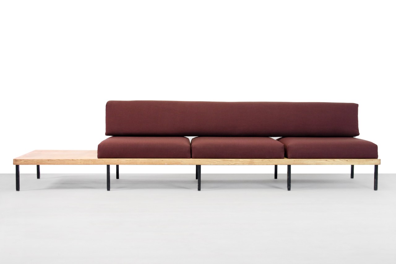 Omschrijving: Prachtige minimalistische design bank van eikenhout met een zwart metalen onderstel. Het ontwerp heeft veel weg van de ontwerpen van Kho Liang Ie of Charlotte Perriand. Het is een uitzonderlijk lange bank met geïntegreerde tafel van wel 3.20 m. De kussens en rugkussen zijn gestoffeerd met een mooie wollen meubelstof met een bordeaux en bruin draad. De bank is 320 cm lang, 68 cm diep en heeft een totale hoogte van 76 cm. De zithoogte is 44 cm. De tafel is 28 cm hoog.
