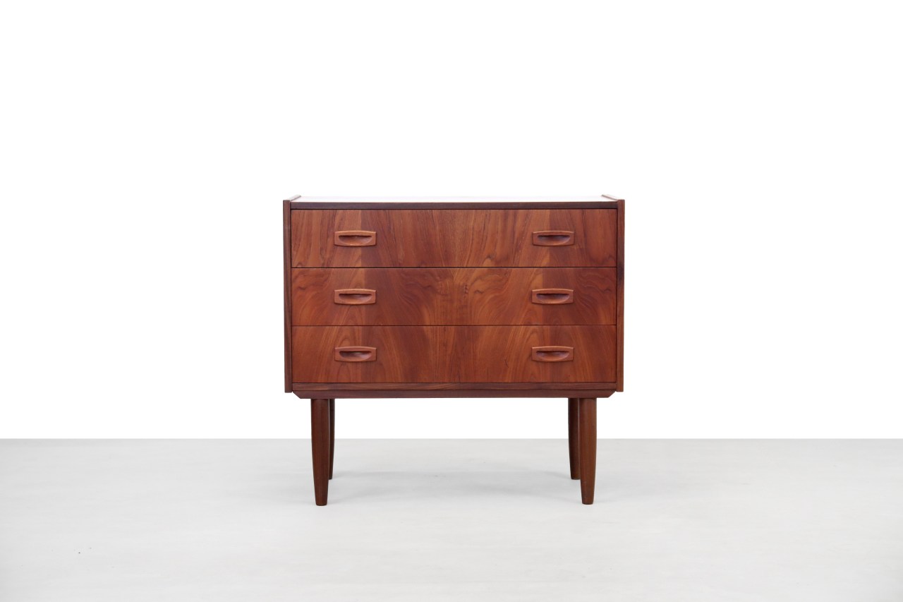 Omschrijving: Mooie Deens design ladekast met 3 lades. Uitgevoerd in teak fineer en massief teakhouten greepjes en pootjes. De vormgeving van de greepjes maken dit kastje een plaatje om te zien. Ook de tekening in het hout is waanzinnig. Ondanks dat de kast maar drie lades heeft, is dit geen kleintje. Deze kast is 77,5 cm breed, 40 cm diep en 70,5 cm hoog.