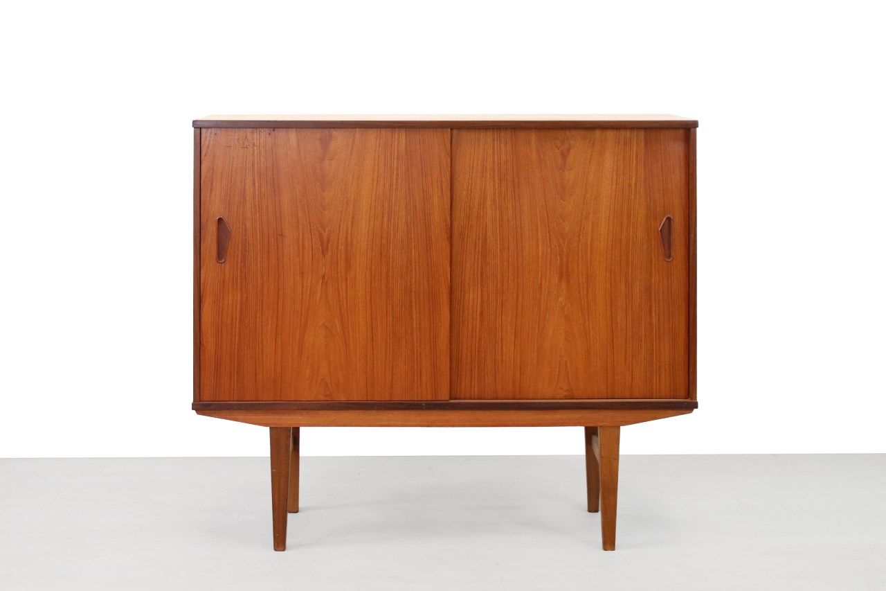 Omschrijving: Zeer leuk formaat teakhouten Deens design highboard. Niet te klein en niet te groot. Gemaakt van een combinatie van massief teakhout en teak fineer. De kast heeft twee schuifdeuren met achter de eerste deur twee planken en achter de tweede deur een plank met een spiegel en daaronder vier lades. De afmeting van het Deense highboard is 128 cm breed, 43 cm diep en 111 cm hoog.