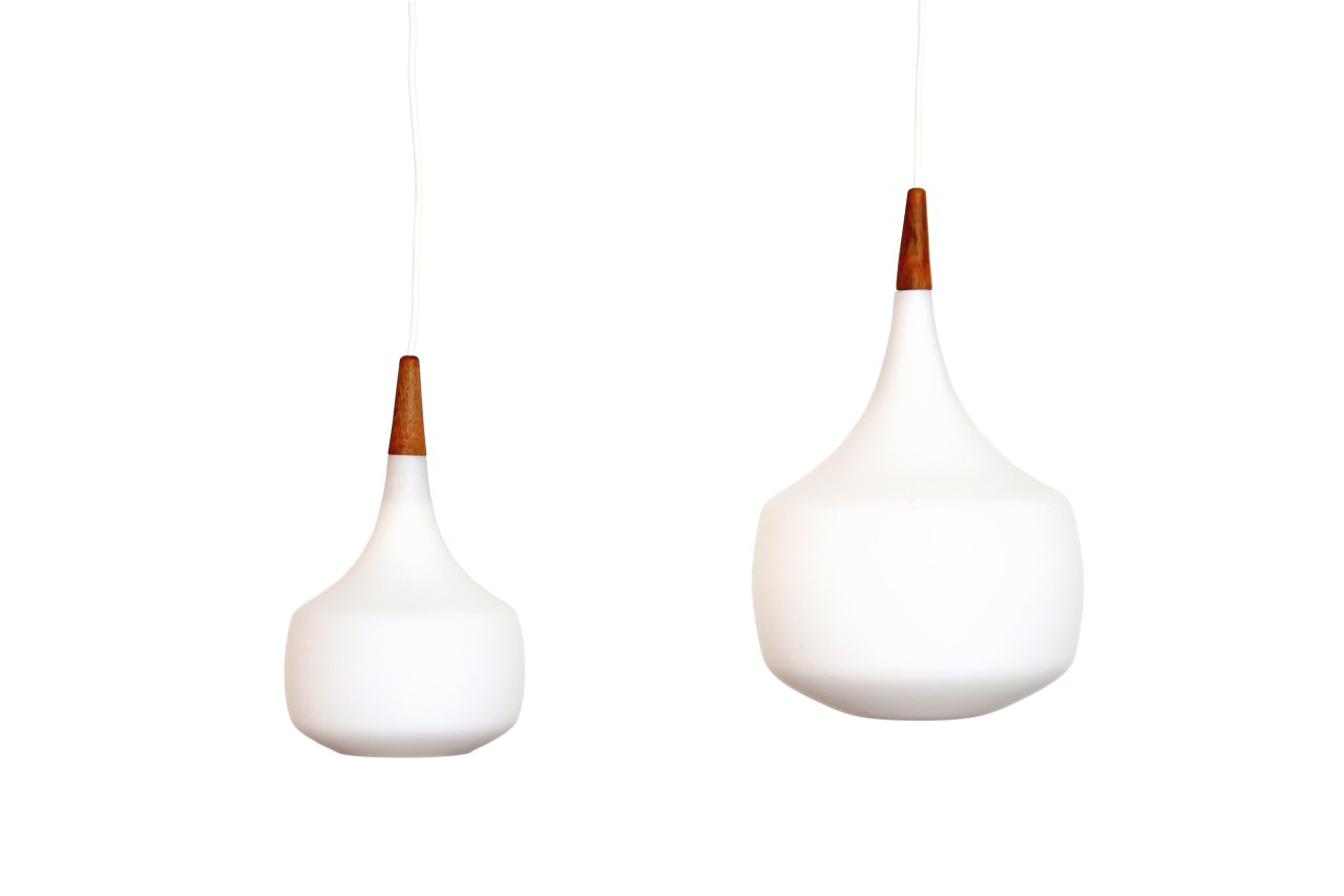 Omschrijving: Prachtige set van twee Holmegaard hanglampen. Gemaakt van opaline melkglas met massief teakhouten details. De twee lampen verschillen in grootte waardoor het een erg mooi combinatie is om ze samen bij elkaar hangen. Of gebruik beide lampen in dezelfde ruimte voor eenheid. De lampen zijn gemaakt door glasfabrikant Holmegaard uit gelijknamige dorp Holmegaard, wat de grootste glasfabrikant is van Denemarken. De grote lamp is 38 cm hoog en heeft een diameter is 25 cm, de kleinere lamp is 28c m hoog en heeft een diameter van 18 cm.