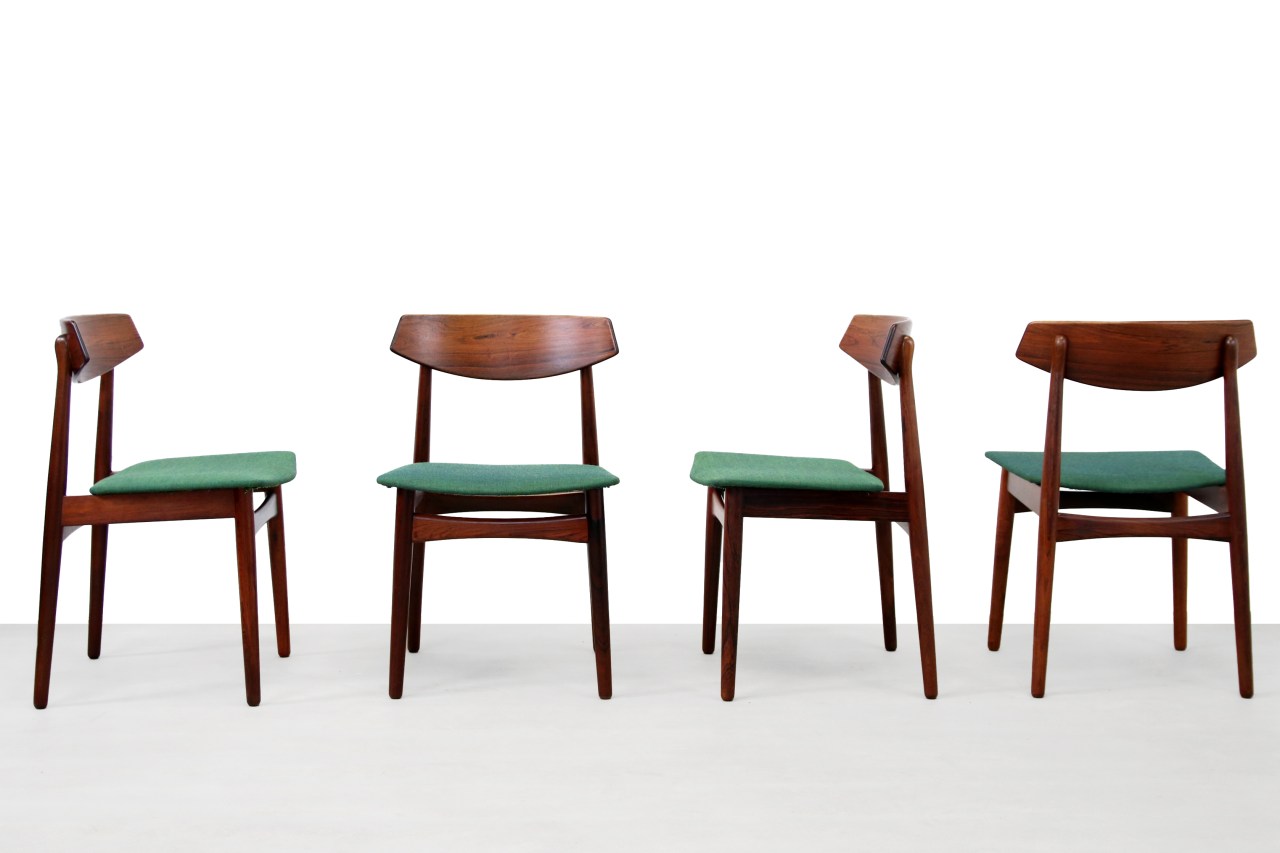 Omschrijving: Een zeer mooie set van vier vintage Deense design stoelen, geproduceerd door Skovby Mobler. Deze set is opnieuw gestoffeerd in een groene kwadrat remix 3 (kleur 982), welke prachtig kleurt met het donkere palissander. De stoelen zijn gemaakt van Brazilian rosewood, een beschermde houtsoort die nu niet meer gekapt mag worden. Het vakmanschap is ongeëvenaard met organische rondingen en veel aandacht voor detail. We hebben een palissander tafel beschikbaar van Johannes Andersen, die erg mooi gecombineerd kan worden bij deze stoelen. De stoelen zijn 48 cm breed en 48 cm diep en zijn 77 cm hoog met een zithoogte 44 cm.